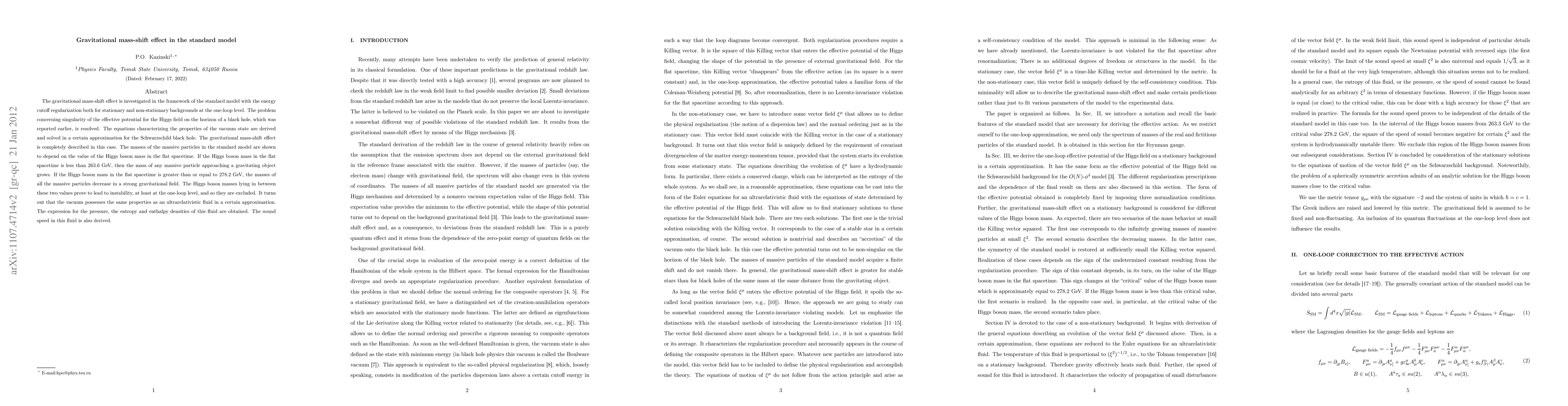 The gravitational mass-shift effect is investigated in the framework of the standard model with the energy cutoff regularization both for stationary and non-stationary backgrounds at the one-loop level. The problem concerning singularity of the effective potential for the Higgs field on the horizon of a black hole, which was reported earlier, is resolved. The equations characterizing the properties of the vacuum state are derived and solved in a certain approximation for the Schwarzschild black hole. The gravitational mass-shift effect is completely described in this case. The masses of the massive particles in the standard model are shown to depend on the value of the Higgs boson mass in the flat spacetime. If the Higgs boson mass in the flat spacetime is less than 263.6 GeV, then the mass of any massive particle approaching a gravitating object grows. If the Higgs boson mass in the flat spacetime is greater than or equal to 278.2 GeV, the masses of all the massive particles decrease in a strong gravitational field. The Higgs boson masses lying in between these two values prove to lead to instability, at least at the one-loop level, and so they are excluded. It turns out that the vacuum possesses the same properties as an ultrarelativistic fluid in a certain approximation. The expression for the pressure, the entropy and enthalpy densities of this fluid are obtained. The sound speed in this fluid is also derived.