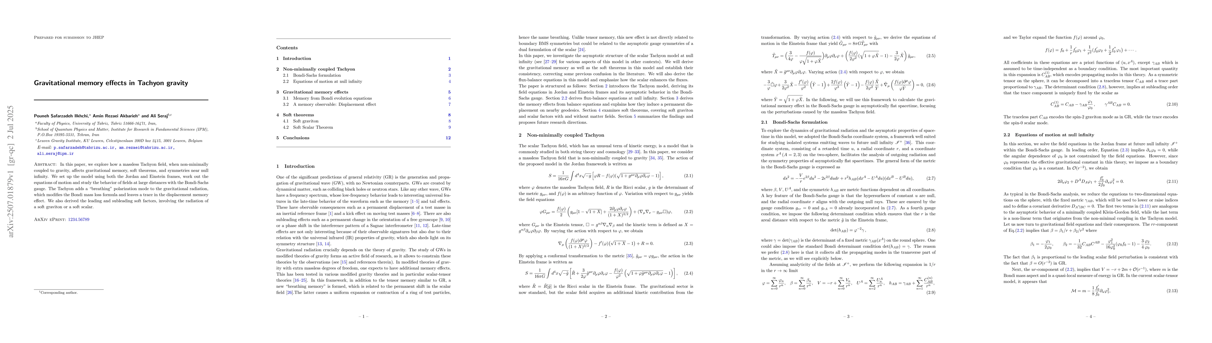 The paper presents a detailed analysis of gravitational memory effects and soft theorems in Tachyon gravity, extending previous work on gravitational waves and memory effects to include non-minimal coupling between a Tachyon field and gravity.