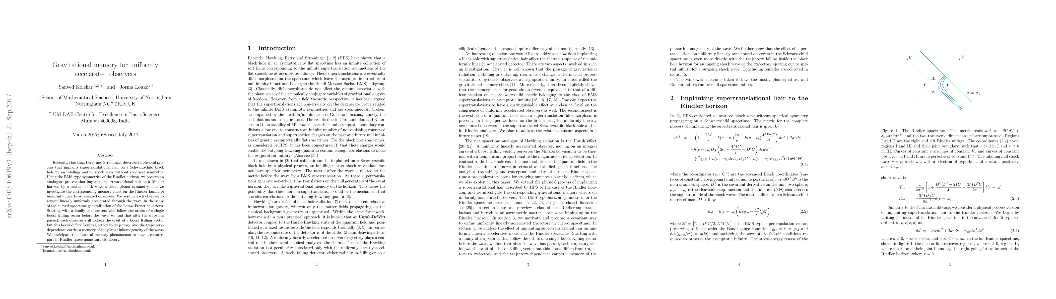 This paper investigates how a matter shock wave without planar symmetry can implant supertranslational hair on a Rindler horizon, leading to a memory effect observed by uniformly accelerated observers. The study finds that each observer retains a unique boost trajectory post-shock, carrying a memory of the wave's inhomogeneity.