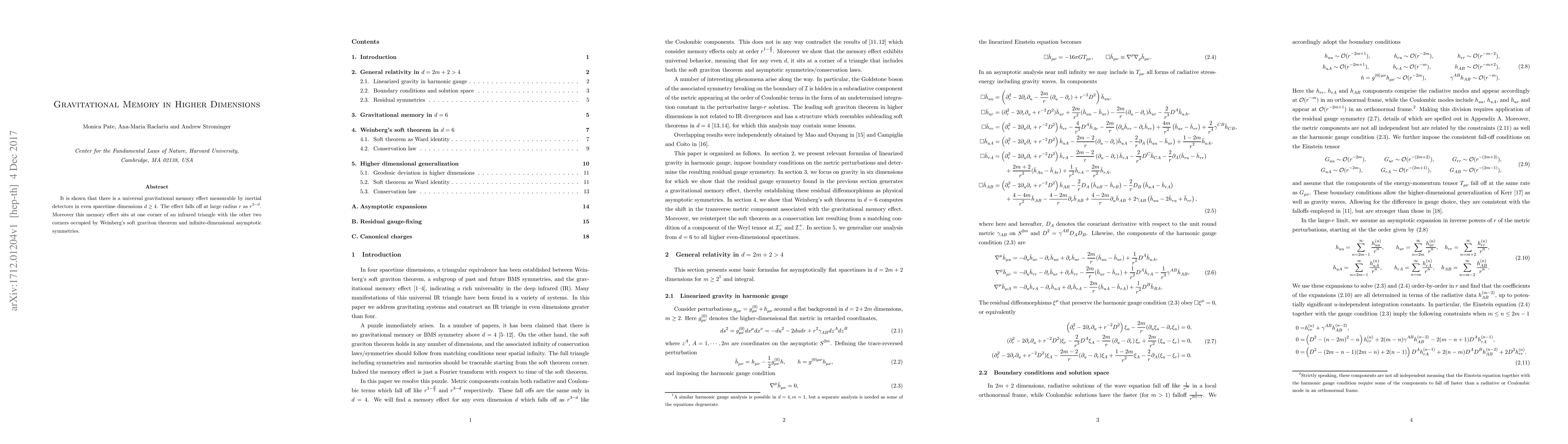 Research confirms a universal gravitational memory effect in higher dimensions, with the phenomenon falling off at large radius like $r^{3-d}$. This discovery relates to infrared triangle theories, including Weinberg's soft graviton theorem and infinite-dimensional asymptotic symmetries.