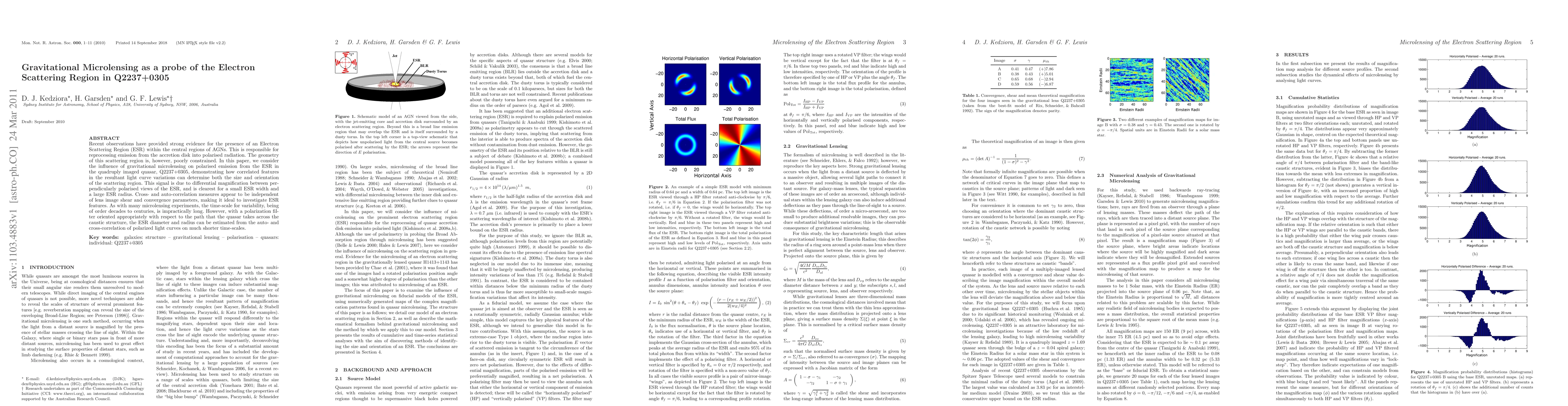 Recent observations have provided strong evidence for the presence of an Electron Scattering Region (ESR) within the central regions of AGNs. This is responsible for reprocessing emission from the accretion disk into polarised radiation. The geometry of this scattering region is, however, poorly constrained. In this paper, we consider the influence of gravitational microlensing on polarised emission from the ESR in the quadruply imaged quasar, Q2237+0305, demonstrating how correlated features in the resultant light curve variations can determine both the size and orientation of the scattering region. This signal is due to differential magnification between perpendicularly polarised views of the ESR, and is clearest for a small ESR width and a large ESR radius. Cross- and auto-correlation measures appear to be independent of lens image shear and convergence parameters, making it ideal to investigate ESR features. As with many microlensing experiments, the time-scale for variability, being of order decades to centuries, is impractically long. However, with a polarization filter oriented appropriately with respect to the path that the quasar takes across the caustic structure, the ESR diameter and radius can be estimated from the auto- and cross-correlation of polarized light curves on much shorter time-scales.