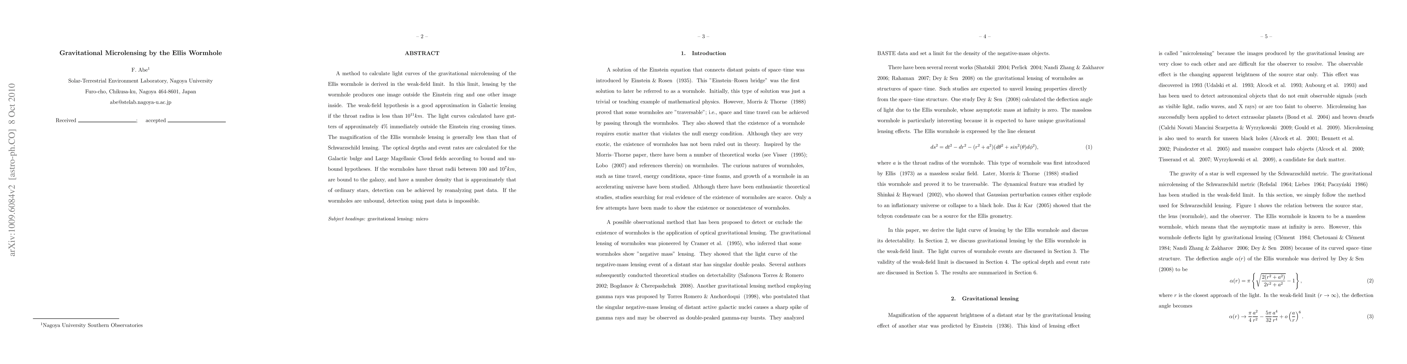 This paper derives a method to calculate light curves for gravitational microlensing by the Ellis wormhole in the weak-field limit, showing that it produces two images, and estimates optical depths and event rates for detection in the Galactic bulge and Large Magellanic Cloud. Detection of wormholes with throat radii between 100 and $10^7 km$ is feasible if they are bound to the galaxy.