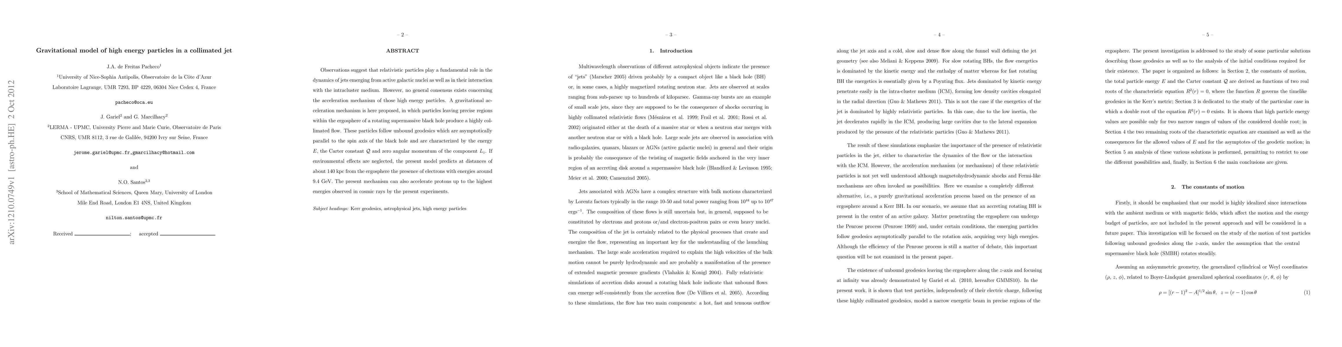 This paper proposes a gravitational acceleration mechanism for high energy particles in jets from active galactic nuclei, suggesting that particles in the ergosphere of a rotating supermassive black hole follow unbound geodesics to produce a collimated jet, potentially explaining the observed energies of electrons and protons.