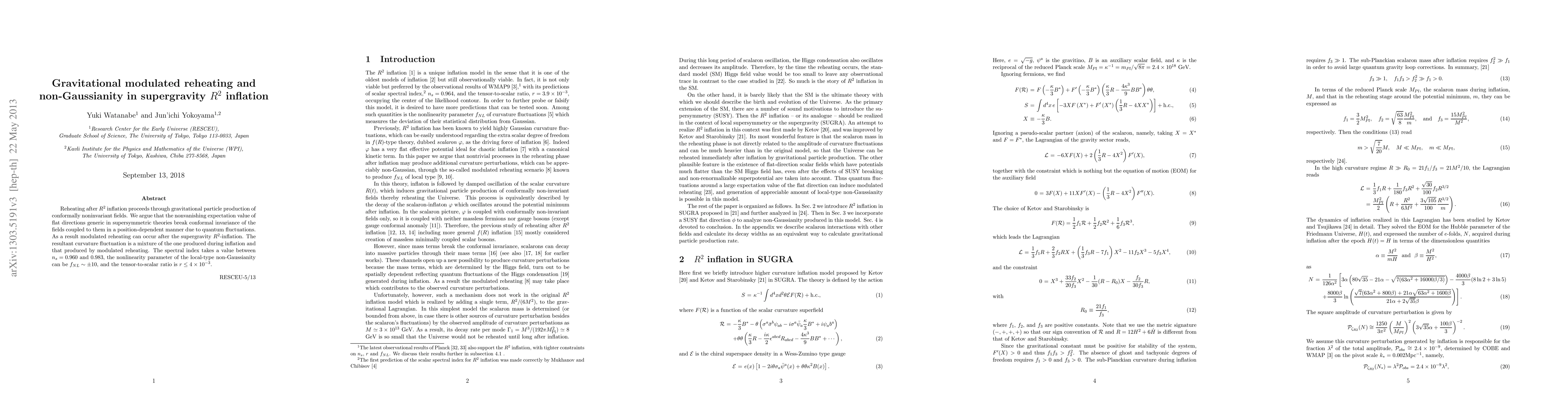 This paper explores gravitational modulated reheating following R^2 inflation in supergravity, arguing that quantum fluctuations in flat directions lead to position-dependent breaking of conformal invariance, resulting in a mixture of inflationary and reheating-induced curvature fluctuations. The study predicts a spectral index between 0.960 and 0.983, local-type non-Gaussianity with f_nl around ±10, and a tensor-to-scalar ratio of r ≤ 4×10^-3.