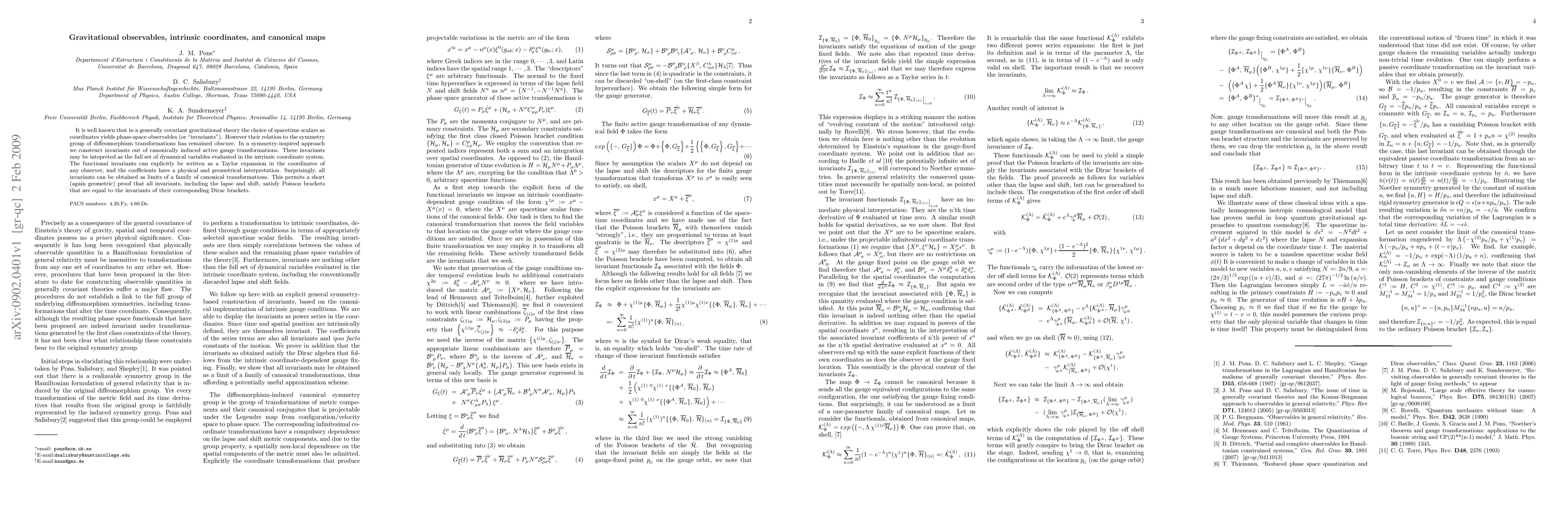 It is well known that in a generally covariant gravitational theory the choice of spacetime scalars as coordinates yields phase-space observables (or "invariants"). However their relation to the symmetry group of diffeomorphism transformations has remained obscure. In a symmetry-inspired approach we construct invariants out of canonically induced active gauge transformations. These invariants may be intepreted as the full set of dynamical variables evaluated in the intrinsic coordinate system. The functional invariants can explicitly be written as a Taylor expansion in the coordinates of any observer, and the coefficients have a physical and geometrical interpretation. Surprisingly, all invariants can be obtained as limits of a family of canonical transformations. This permits a short (again geometric) proof that all invariants, including the lapse and shift, satisfy Poisson brackets that are equal to the invariants of their corresponding Dirac brackets.