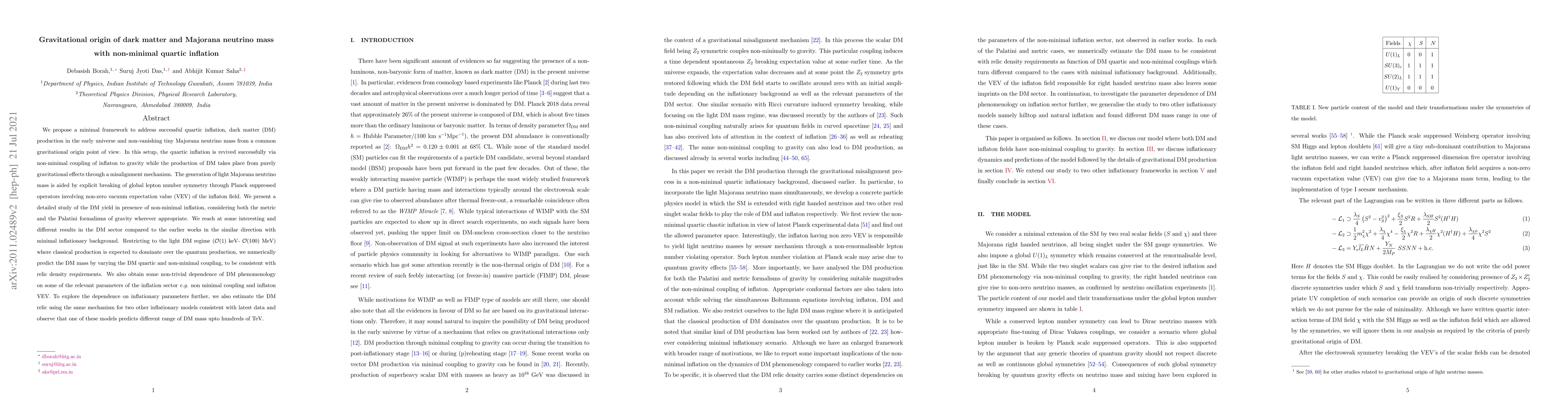 We propose a minimal framework to address successful quartic inflation, dark matter (DM) production in the early universe and non-vanishing tiny Majorana neutrino mass from a common gravitational origin point of view. In this setup, the quartic inflation is revived successfully via non-minimal coupling of inflaton to gravity while the production of DM takes place from purely gravitational effects through a misalignment mechanism. The generation of light Majorana neutrino mass is aided by explicit breaking of global lepton number symmetry through Planck suppressed operators involving non-zero vacuum expectation value (VEV) of the inflaton field. We present a detailed study of the DM yield in presence of non-minimal inflation, considering both the metric and the Palatini formalisms of gravity wherever appropriate. We reach at some interesting and different results in the DM sector compared to the earlier works in the similar direction with minimal inflationary background. Restricting to the light DM regime ($\mathcal{O}(1)$ keV- $\mathcal{O}(100)$ MeV) where classical production is expected to dominate over the quantum production, we numerically predict the DM mass by varying the DM quartic and non-minimal coupling, to be consistent with relic density requirements. We also obtain some non-trivial dependence of DM phenomenology on some of the relevant parameters of the inflation sector {\it e.g.} non minimal coupling and inflaton VEV. To explore the dependence on inflationary parameters further, we also estimate the DM relic using the same mechanism for two other inflationary models consistent with latest data and observe that one of these models predicts different range of DM mass upto hundreds of TeV.