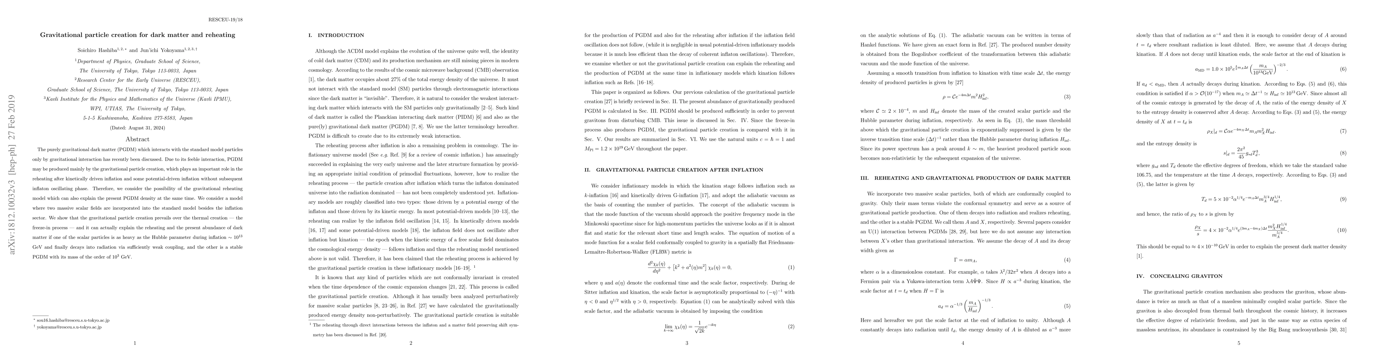 This paper explores a purely gravitational dark matter (PGDM) model where PGDM particles are primarily created through gravitational processes during reheating after inflation. It proposes a model with two massive scalar fields, showing that gravitational particle creation can explain both reheating and the current dark matter density if one scalar is heavy and decays into radiation, while the other remains stable as PGDM.