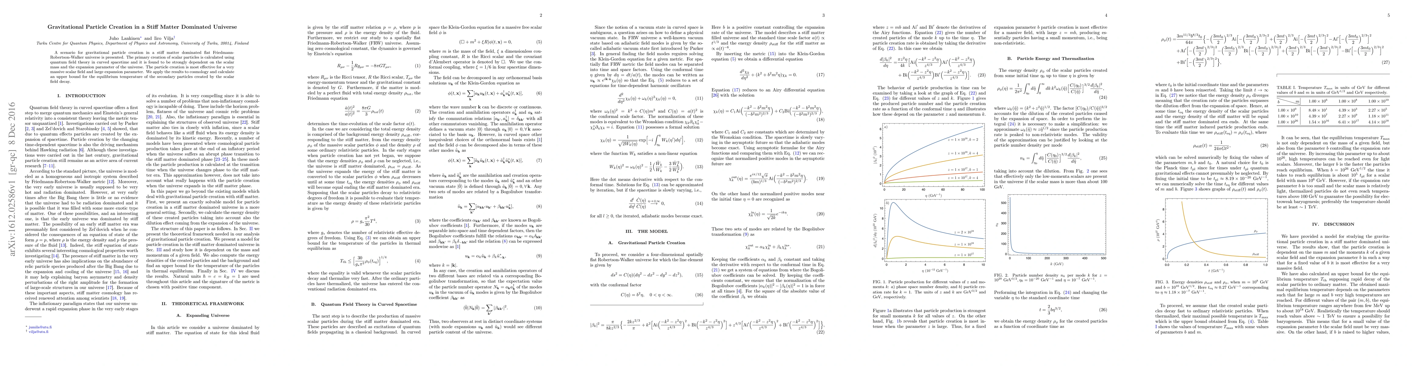 This paper investigates gravitational particle creation in a stiff matter dominated universe, finding that scalar particle production is highly dependent on scalar mass and the universe's expansion. The study calculates an upper bound for the equilibrium temperature of secondary particles resulting from the decay of the primary scalar particles.