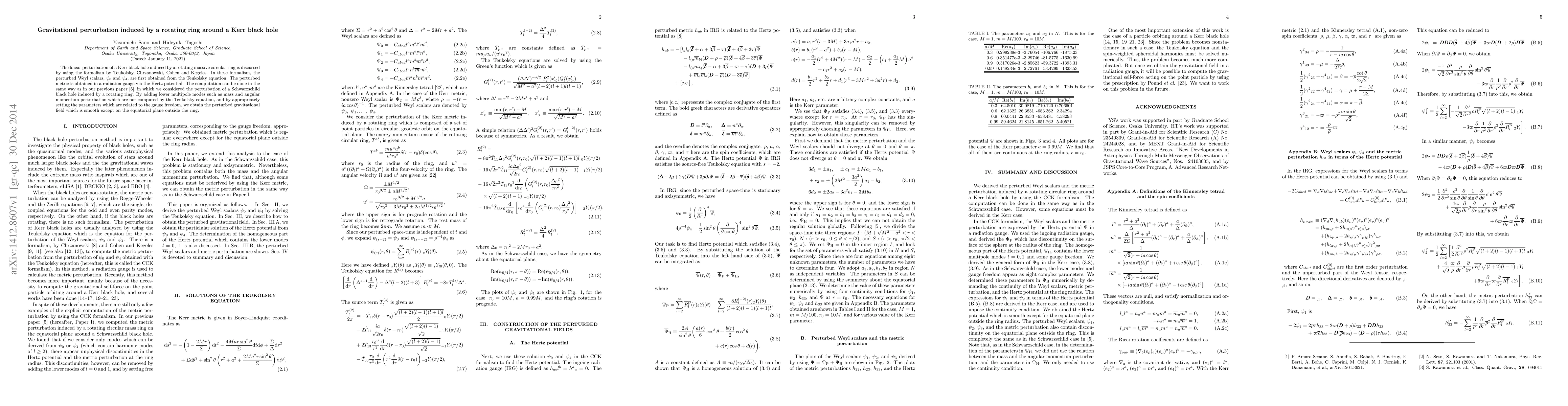 The linear perturbation of a Kerr black hole induced by a rotating massive circular ring is discussed by using the formalism by Teukolsky, Chrzanowski, Cohen and Kegeles. In these formalism, the perturbed Weyl scalars, $\psi_0$ and $\psi_4$, are first obtained from the Teukolsky equation. The perturbed metric is obtained in a radiation gauge via the Hertz potential. The computation can be done in the same way as in our previous paper, in which we considered the perturbation of a Schwarzschild black hole induced by a rotating ring. By adding lower multipole modes such as mass and angular momentum perturbation which are not computed by the Teukolsky equation, and by appropriately setting the parameters which are related to the gauge freedom, we obtain the perturbed gravitational field which is smooth except on the equatorial plane outside the ring.