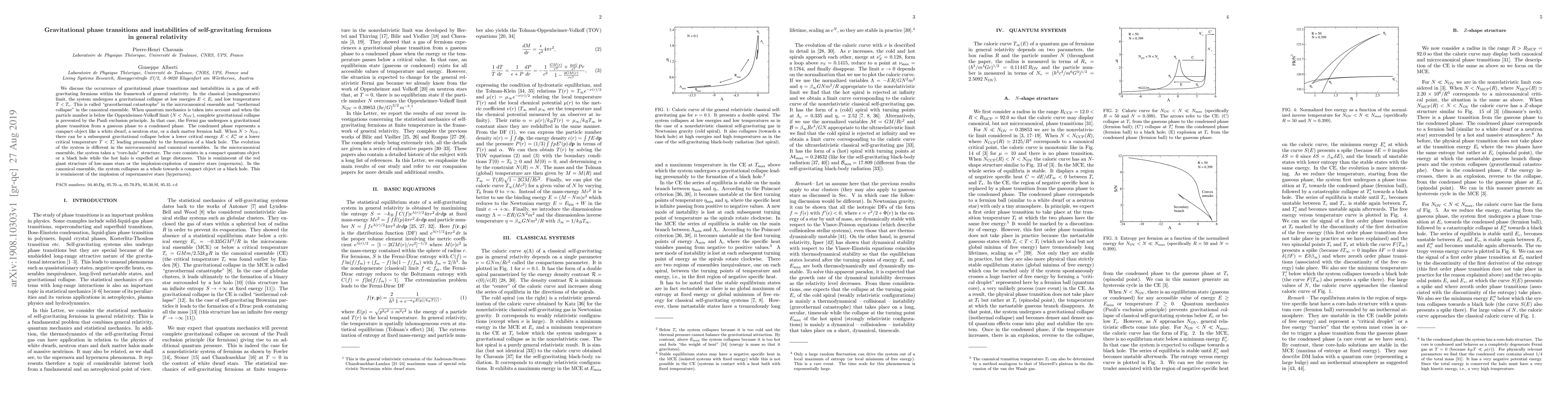 A study on self-gravitating fermions in general relativity reveals that at low energies and temperatures, a gas of these particles undergoes a gravitational collapse, eventually forming compact objects like white dwarfs or black holes. The process is influenced by quantum mechanics and the Pauli exclusion principle, leading to different outcomes in microcanonical and canonical ensembles.