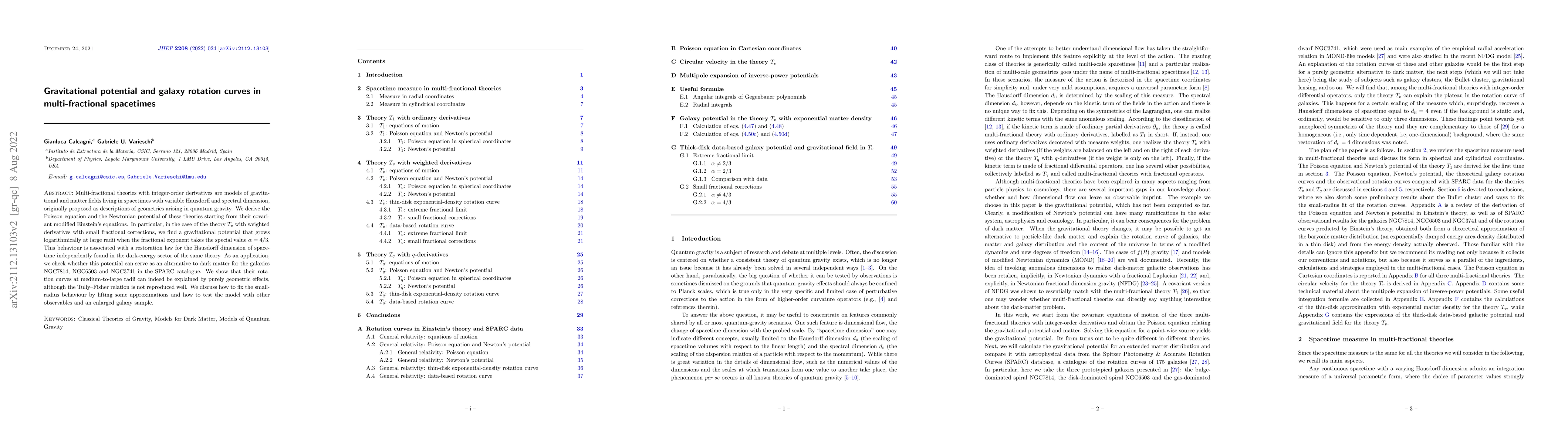 This paper explores multi-fractional spacetime theories, deriving their gravitational potential and applying it to galaxy rotation curves. It finds a logarithmic potential growth at large radii in a specific theory, which can explain medium-to-large radii rotation curves without dark matter, though it does not match the Tully--Fisher relation well.