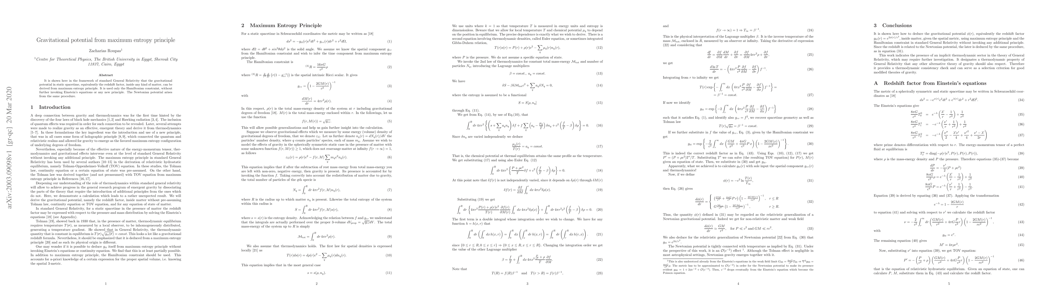 This paper demonstrates that the gravitational potential in static spacetime, including the redshift factor, can be derived from the maximum entropy principle using only the Hamiltonian constraint, without invoking Einstein's equations or additional principles. The Newtonian potential also emerges from this approach.