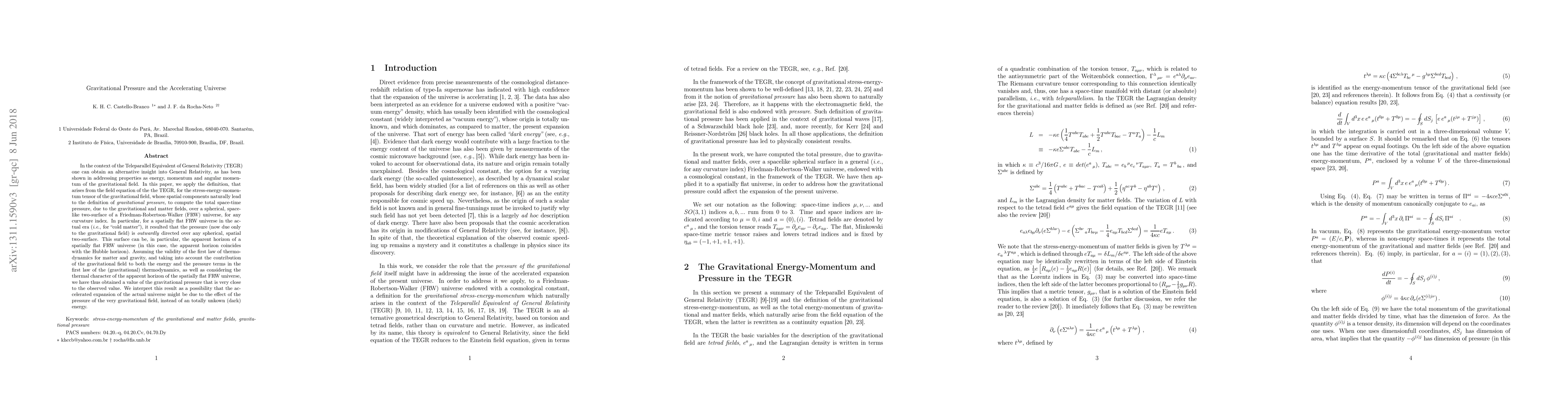 This paper explores gravitational pressure within the Teleparallel Equivalent of General Relativity (TEGR) framework, showing that gravitational pressure in a spatially flat Friedmann-Robertson-Walker universe is outwardly directed. The study suggests that this gravitational pressure could be responsible for the universe's accelerated expansion, potentially eliminating the need for dark energy.