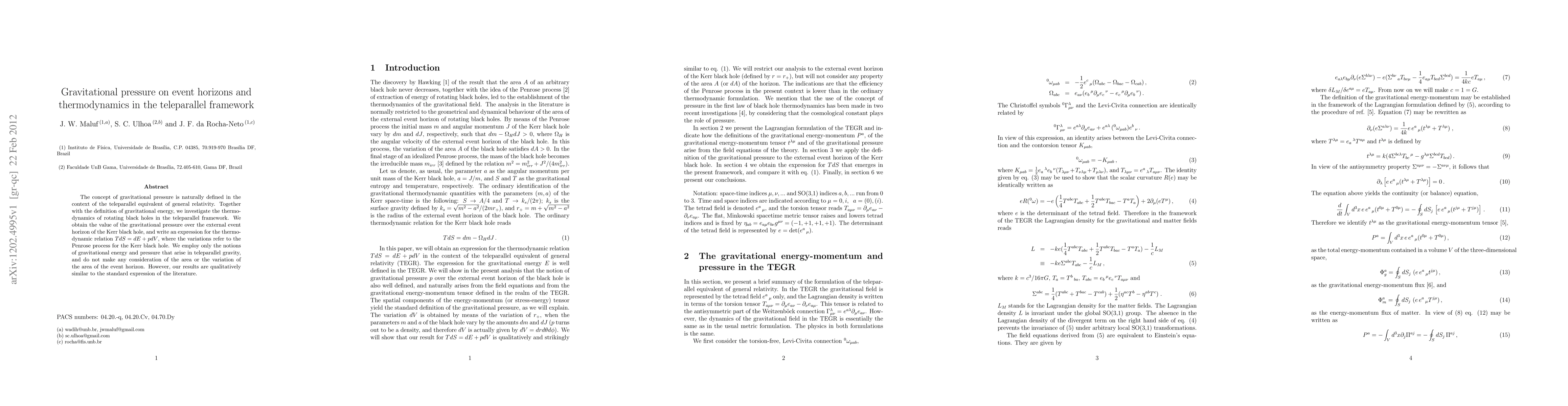 The concept of gravitational pressure is naturally defined in the context of the teleparallel equivalent of general relativity. Together with the definition of gravitational energy, we investigate the thermodynamics of rotating black holes in the teleparallel framework. We obtain the value of the gravitational pressure over the external event horizon of the Kerr black hole, and write an expression for the thermodynamic relation $TdS =dE + pdV$, where the variations refer to the Penrose process for the Kerr black hole. We employ only the notions of gravitational energy and pressure that arise in teleparallel gravity, and do not make any consideration of the area or the variation of the area of the event horizon. However, our results are qualitatively similar to the standard expression of the literature.