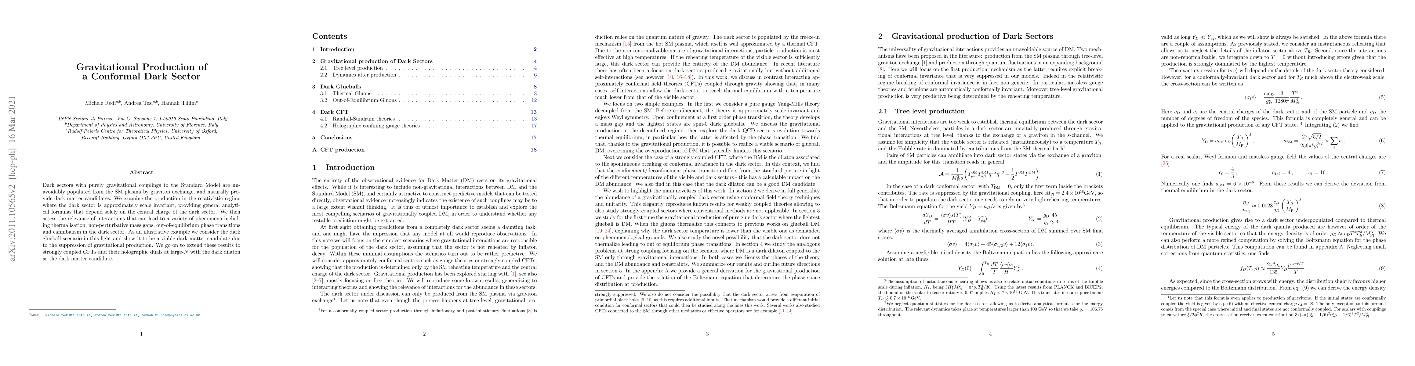 The research investigates the gravitational production of a conformal dark sector, focusing on dynamics in the relativistic regime where results are model-independent, except for elementary scalars and gravitons due to approximate conformal invariance.