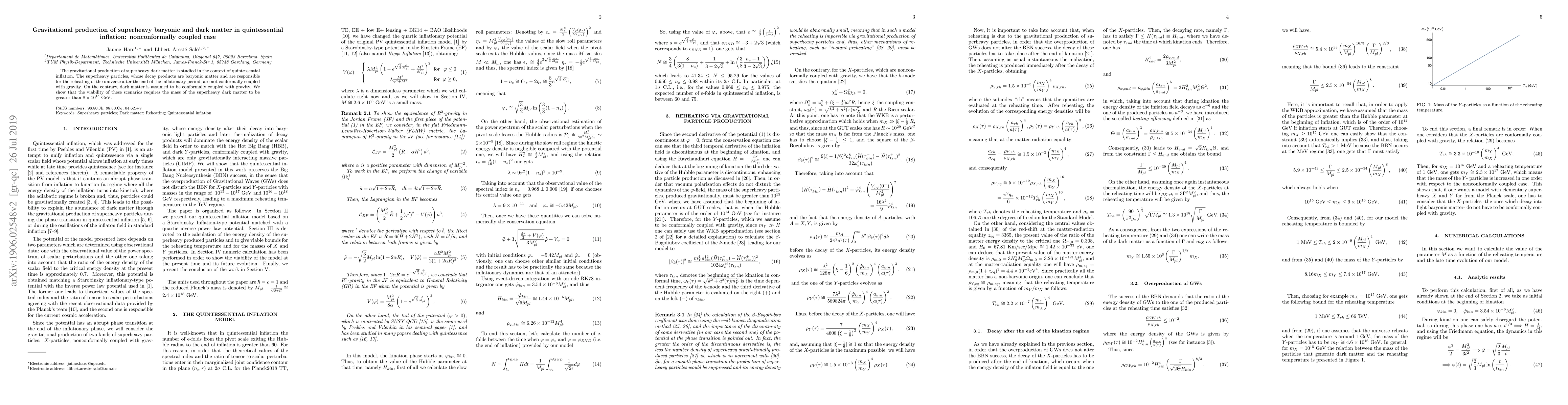 The study explores gravitational production of superheavy baryonic and dark matter in quintessential inflation, where superheavy particles decay into baryonic matter and reheat the universe, but are nonconformally coupled to gravity, contrasting with conformally coupled dark matter. The findings indicate that the mass of superheavy dark matter must exceed 8 x 10^15 GeV for these scenarios to be viable.