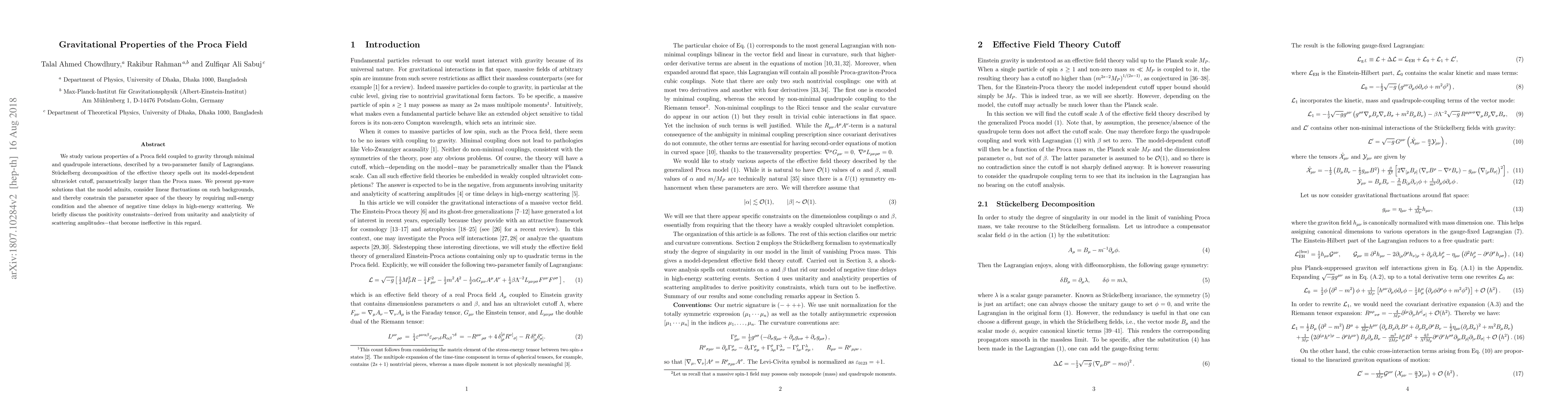 We study various properties of a Proca field coupled to gravity through minimal and quadrupole interactions, described by a two-parameter family of Lagrangians. St\"uckelberg decomposition of the effective theory spells out its model-dependent ultraviolet cutoff, parametrically larger than the Proca mass. We present pp-wave solutions that the model admits, consider linear fluctuations on such backgrounds, and thereby constrain the parameter space of the theory by requiring null-energy condition and the absence of negative time delays in high-energy scattering. We briefly discuss the positivity constraints$-$derived from unitarity and analyticity of scattering amplitudes$-$that become ineffective in this regard.