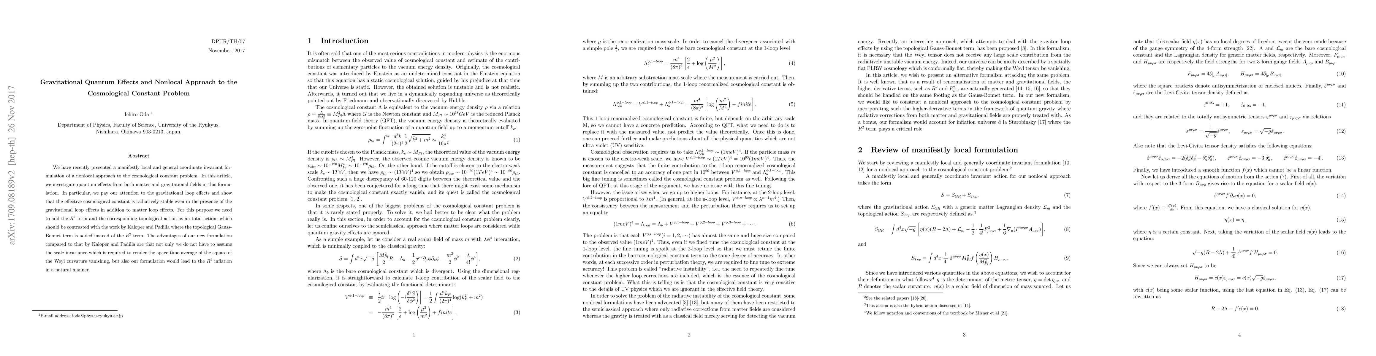 This paper presents a local and general coordinate invariant nonlocal approach to the cosmological constant problem, focusing on quantum effects from both matter and gravitational fields. It shows that the effective cosmological constant remains stable under radiative corrections, contrasting with previous works by adding an $R^2$ term instead of the Gauss-Bonnet term, offering advantages like avoiding scale invariance assumptions and naturally leading to $R^2$ inflation.