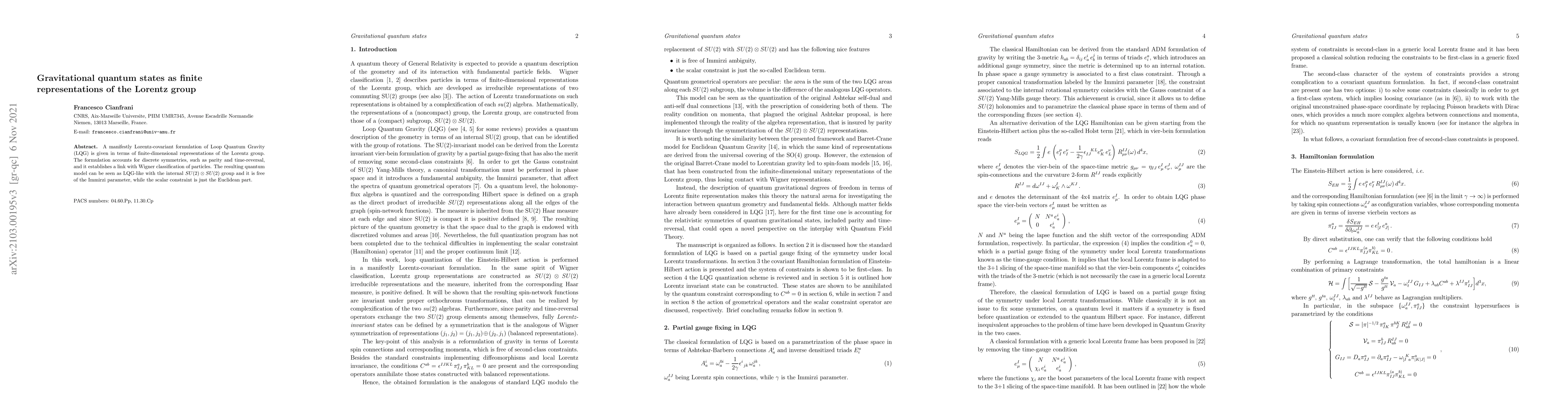 This research presents a Lorentz-covariant formulation of Loop Quantum Gravity using finite-dimensional Lorentz group representations, incorporating discrete symmetries and connecting to Wigner particle classification. The model eliminates the Immirzi parameter and simplifies the scalar constraint to its Euclidean part.