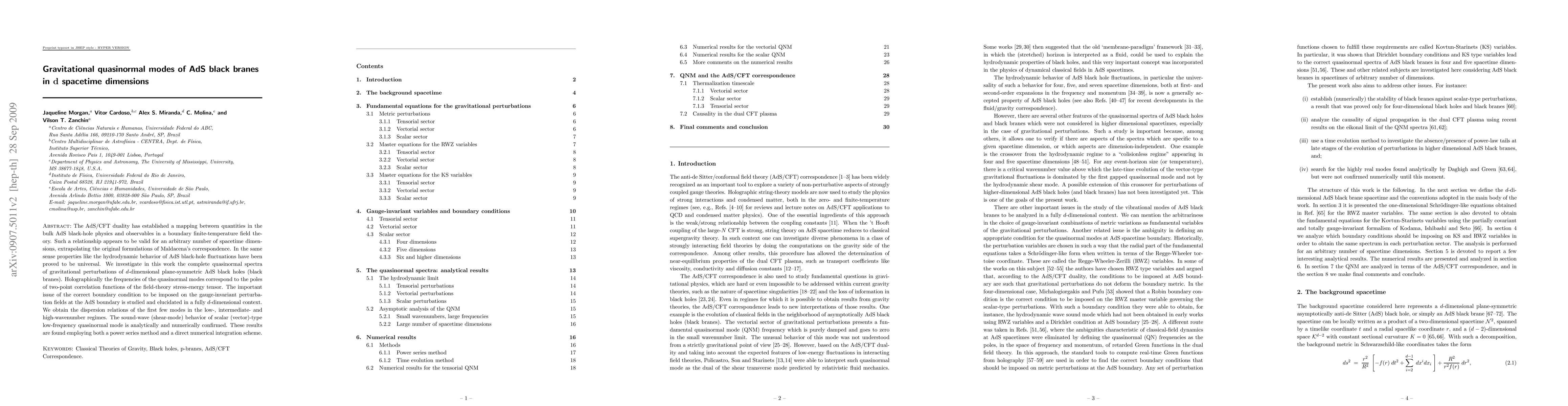 The AdS/CFT duality has established a mapping between quantities in the bulk AdS black-hole physics and observables in a boundary finite-temperature field theory. Such a relationship appears to be valid for an arbitrary number of spacetime dimensions, extrapolating the original formulations of Maldacena's correspondence. In the same sense properties like the hydrodynamic behavior of AdS black-hole fluctuations have been proved to be universal. We investigate in this work the complete quasinormal spectra of gravitational perturbations of $d$-dimensional plane-symmetric AdS black holes (black branes). Holographically the frequencies of the quasinormal modes correspond to the poles of two-point correlation functions of the field-theory stress-energy tensor. The important issue of the correct boundary condition to be imposed on the gauge-invariant perturbation fields at the AdS boundary is studied and elucidated in a fully $d$-dimensional context. We obtain the dispersion relations of the first few modes in the low-, intermediate- and high-wavenumber regimes. The sound-wave (shear-mode) behavior of scalar (vector)-type low-frequency quasinormal mode is analytically and numerically confirmed. These results are found employing both a power series method and a direct numerical integration scheme.