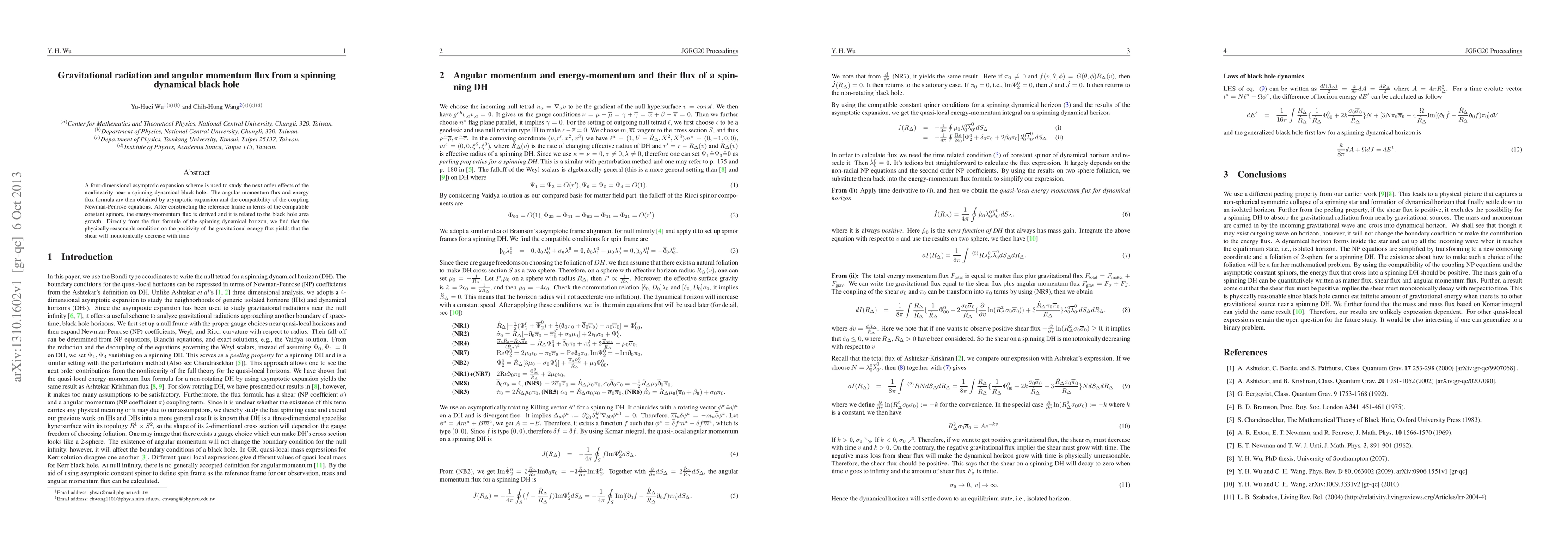 A four-dimensional asymptotic expansion scheme is used to study the next order effects of the nonlinearity near a spinning dynamical black hole. The angular momentum flux and energy flux formula are then obtained by asymptotic expansion and the compatibility of the coupling Newman-Penrose equations. After constructing the reference frame in terms of the compatible constant spinors, the energy-momentum flux is derived and it is related to the black hole area growth. Directly from the flux formula of the spinning dynamical horizon, we find that the physically reasonable condition on the positivity of the gravitational energy flux yields that the shear will monotonically decrease with time.