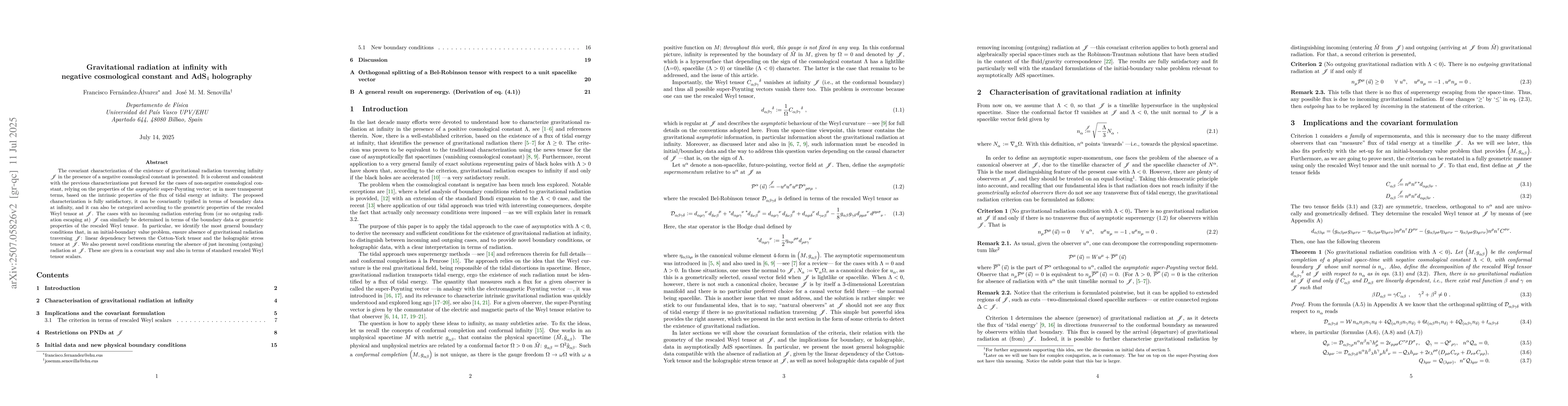 The covariant characterization of the existence of gravitational radiation traversing infinity $\mathscr{J}$ in the presence of a negative cosmological constant is presented. It is coherent and consistent with the previous characterizations put forward for the cases of non-negative cosmological constant, relying on the properties of the asymptotic super-Poynting vector; or in more transparent terms, based on the intrinsic properties of the flux of tidal energy at infinity. The proposed characterization is fully satisfactory, it can be covariantly typified in terms of boundary data at infinity, and it can also be categorized according to the geometric properties of the rescaled Weyl tensor at $\mathscr{J}$. The cases with no incoming radiation entering from (or no outgoing radiation escaping at) $\mathscr{J}$ can similarly be determined in terms of the boundary data or geometric properties of the rescaled Weyl tensor. In particular, we identify the most general boundary conditions that, in an initial-boundary value problem, ensure absence of gravitational radiation traversing $\mathscr{J}$: linear dependency between the Cotton-York tensor and the holographic stress tensor at $\mathscr{J}$. We also present novel conditions ensuring the absence of just incoming (outgoing) radiation at $\mathscr{J}$. These are given in a covariant way and also in terms of standard rescaled Weyl tensor scalars.