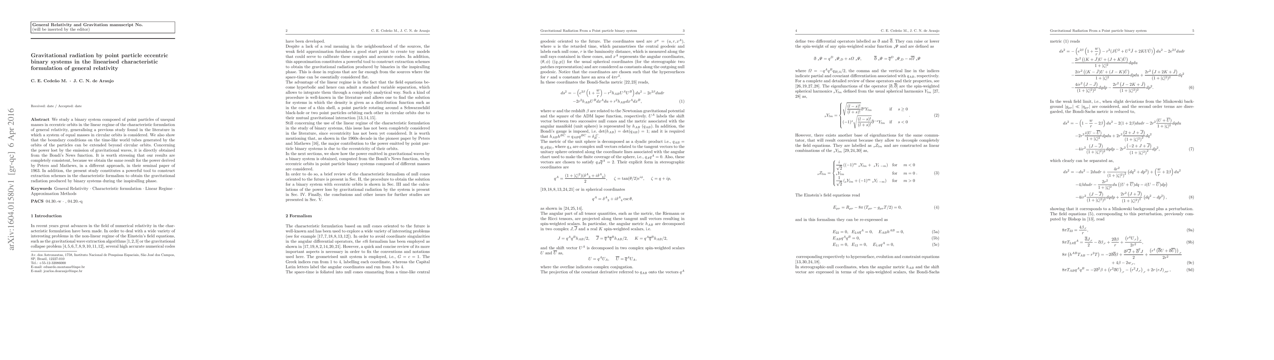 We study a binary system composed of point particles of unequal masses in eccentric orbits in the linear regime of the characteristic formulation of general relativity, generalising a previous study found in the literature in which a system of equal masses in circular orbits is considered. We also show that the boundary conditions on the time-like world tubes generated by the orbits of the particles can be extended beyond circular orbits. Concerning the power lost by the emission of gravitational waves, it is directly obtained from the Bondi's News function. It is worth stressing that our results are completely consistent, because we obtain the same result for the power derived by Peters and Mathews, in a different approach, in their seminal paper of 1963. In addition, the present study constitutes a powerful tool to construct extraction schemes in the characteristic formalism to obtain the gravitational radiation produced by binary systems during the inspiralling phase.