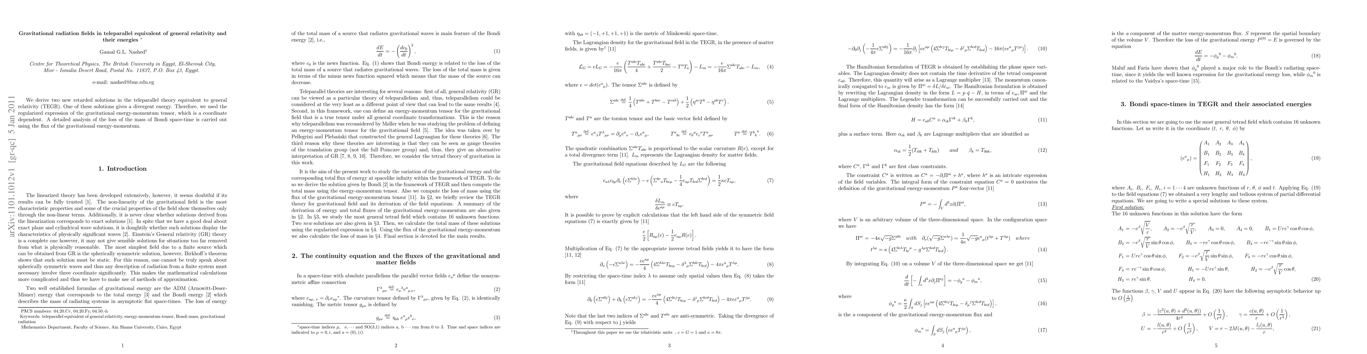 Researchers derived new solutions in a theory equivalent to general relativity that predict gravitational radiation fields with divergent energies, leading to a loss of mass in certain space-time configurations.