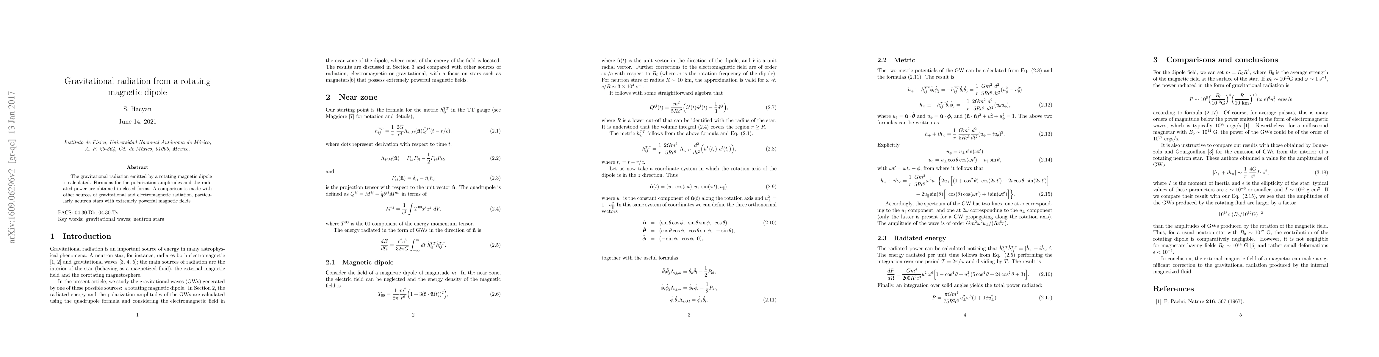 This paper calculates gravitational radiation from a rotating magnetic dipole, deriving closed-form expressions for polarization amplitudes and radiated power. It compares these results to gravitational and electromagnetic radiation from neutron stars with strong magnetic fields.