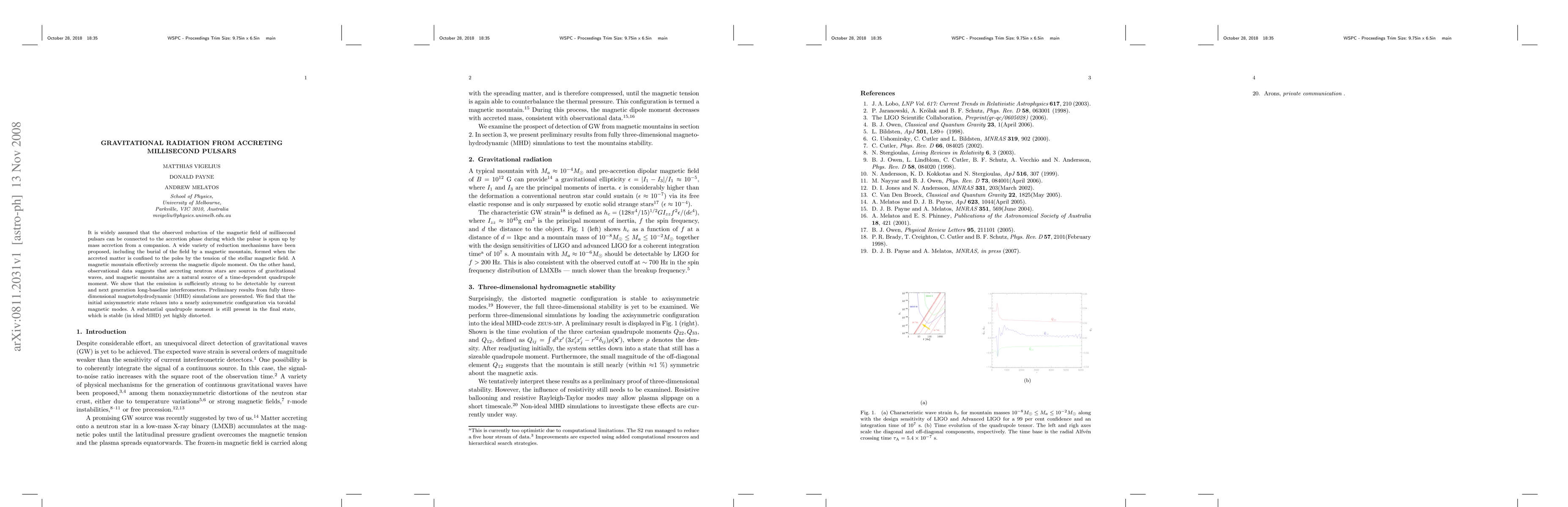 This paper investigates the gravitational radiation from accreting millisecond pulsars, proposing that magnetic mountains formed during accretion can screen the magnetic dipole moment and generate detectable gravitational waves. The study uses three-dimensional MHD simulations to show that the system stabilizes with a substantial, though distorted, quadrupole moment.
