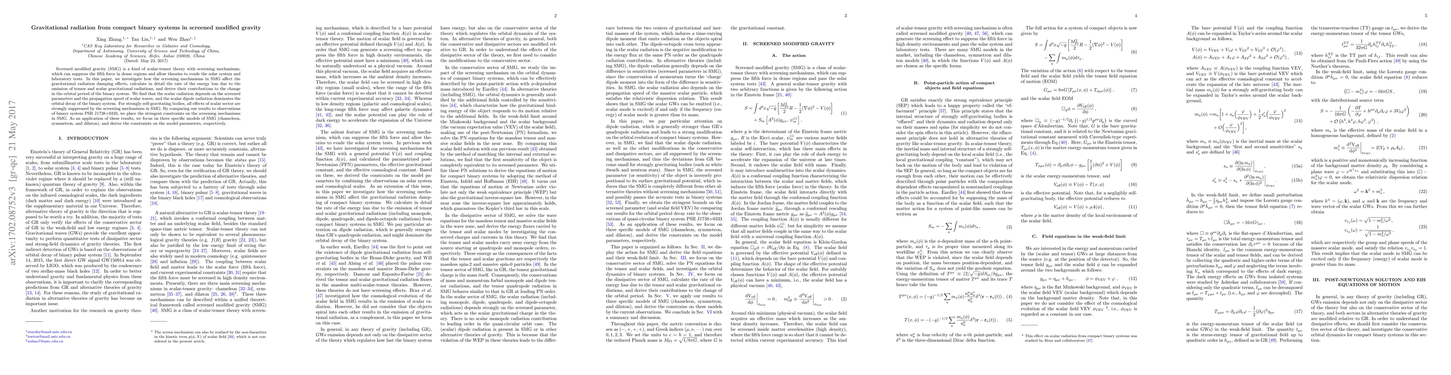 This paper examines how screening mechanisms in screened modified gravity affect the gravitational radiation from compact binary systems, finding that scalar dipole radiation dominates orbital decay. It places constraints on specific SMG models (chameleon, symmetron, and dilaton) by comparing theoretical predictions with observations of binary system PSR J1738+0333.