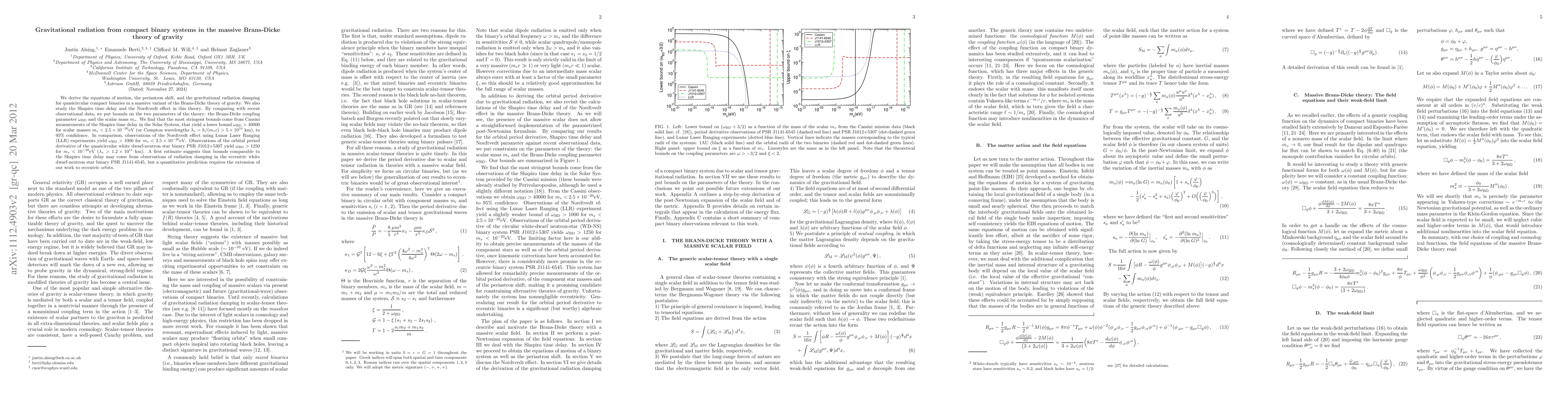 This paper derives the equations of motion and gravitational radiation damping for compact binaries in the massive Brans-Dicke theory, comparing results with observational data to constrain the theory's parameters. Cassini measurements provide the most stringent bounds on the Brans-Dicke coupling parameter and scalar mass.