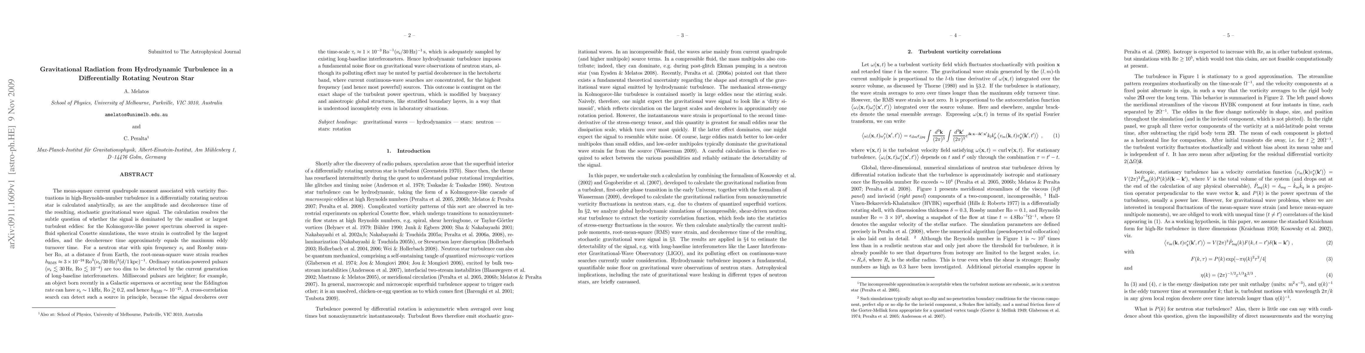 (Abridged.) The mean-square current quadrupole moment associated with vorticity fluctuations in high-Reynolds-number turbulence in a differentially rotating neutron star is calculated analytically, as are the amplitude and decoherence time of the resulting, stochastic gravitational wave signal. The calculation resolves the subtle question of whether the signal is dominated by the smallest or largest turbulent eddies: for the Kolmogorov-like power spectrum observed in superfluid spherical Couette simulations, the wave strain is controlled by the largest eddies, and the decoherence time approximately equals the maximum eddy turnover time. For a neutron star with spin frequency $\nu_s$ and Rossby number $Ro$, at a distance $d$ from Earth, the root-mean-square wave strain reaches $h_{RMS} \approx 3\times 10^{-24} Ro^3 (\nu_s / 30 Hz)^3 (d/1 kpc)^{-1}$. A cross-correlation search can detect such a source in principle, because the signal decoheres over the time-scale $\tau_c \approx 10^{-3} Ro^{-1} (\nu_s / 30 Hz)^{-1} s$, which is adequately sampled by existing long-baseline interferometers. Hence hydrodynamic turbulence imposes a fundamental noise floor on gravitational wave observations of neutron stars, although its polluting effect may be muted by partial decoherence in the hectohertz band, where current continuous-wave searches are concentrated, for the highest frequency (and hence most powerful) sources.