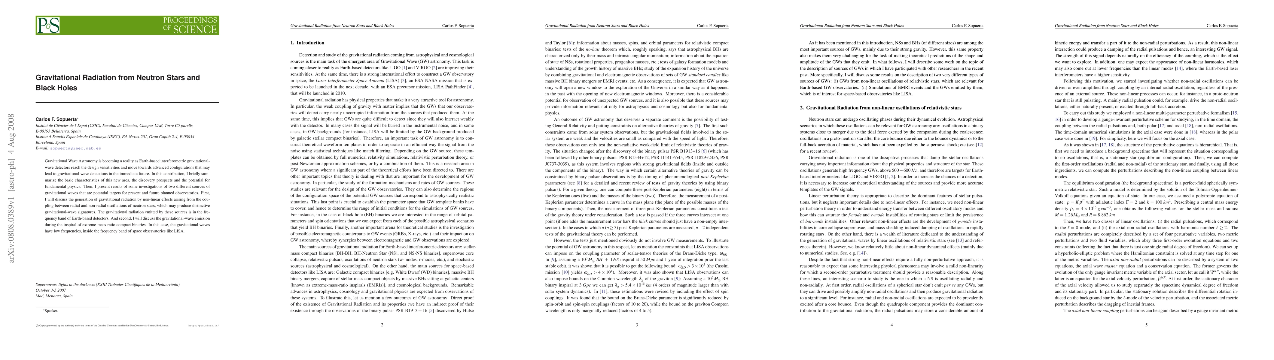 Gravitational Wave Astronomy is becoming a reality as Earth-based interferometric gravitational-wave detectors reach the design sensitivities and move towards advanced configurations that may lead to gravitational-wave detections in the immediate future. In this contribution, I briefly summarize the basic characteristics of this new area, the discovery prospects and the potential for fundamental physics. Then, I present results of some investigations of two different sources of gravitational waves that are potential targets for present and future planned observatories. First, I will discuss the generation of gravitational radiation by non-linear effects arising from the coupling between radial and non-radial oscillations of neutron stars, which may produce distinctive gravitational-wave signatures. The gravitational radiation emitted by these sources is in the frequency band of Earth-based detectors. And second, I will discuss the gravitational-wave emission during the inspiral of extreme-mass-ratio compact binaries. In this case, the gravitational waves have low frequencies, inside the frequency band of space observatories like LISA.