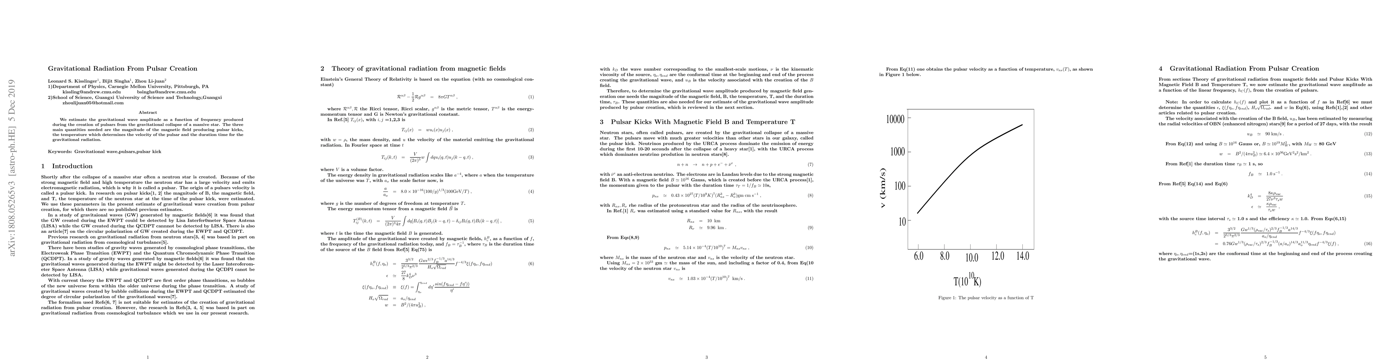 We estimate the gravitational wave amplitude as a function of frequency produced during the creation of pulsars from the gravitational collapse of a massive star. The three main quantities needed are the magnitude of the magnetic field producing pulsar kicks, the temperature which determines the velocity of the pulsar and the duration time for the gravitational radiation.res