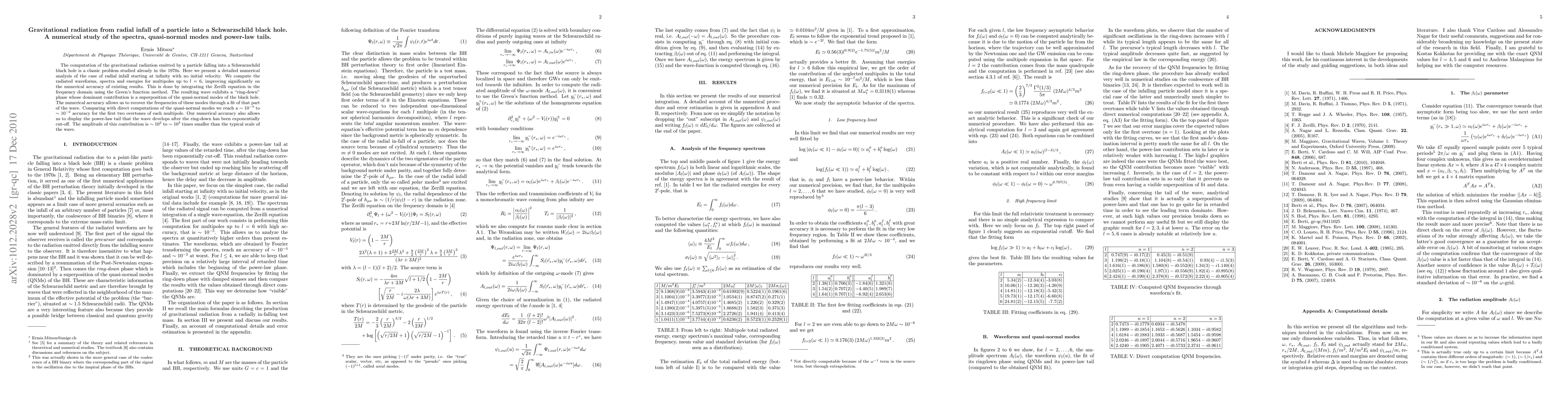 This paper presents a detailed numerical analysis of gravitational radiation from a particle radially falling into a Schwarzschild black hole, focusing on the waveforms, spectra, and energies up to multipoles l = 6. The study reveals quasi-normal modes and power-law tails, achieving high accuracy in the frequencies of the modes and displaying the post-ring-down tail.