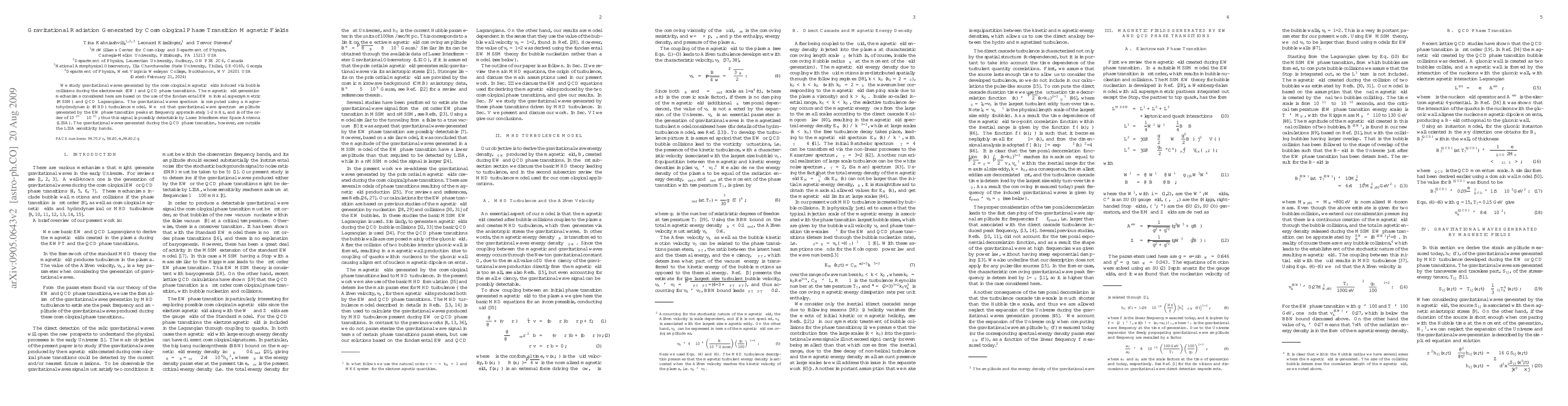 This paper investigates gravitational waves produced by cosmological magnetic fields from bubble collisions during electroweak and QCD phase transitions, using MSSM and QCD Lagrangians. The study finds that gravitational waves from the electroweak transition could peak around 1-2 mHz with an amplitude detectable by LISA, while those from QCD phase transitions are beyond LISA's sensitivity.