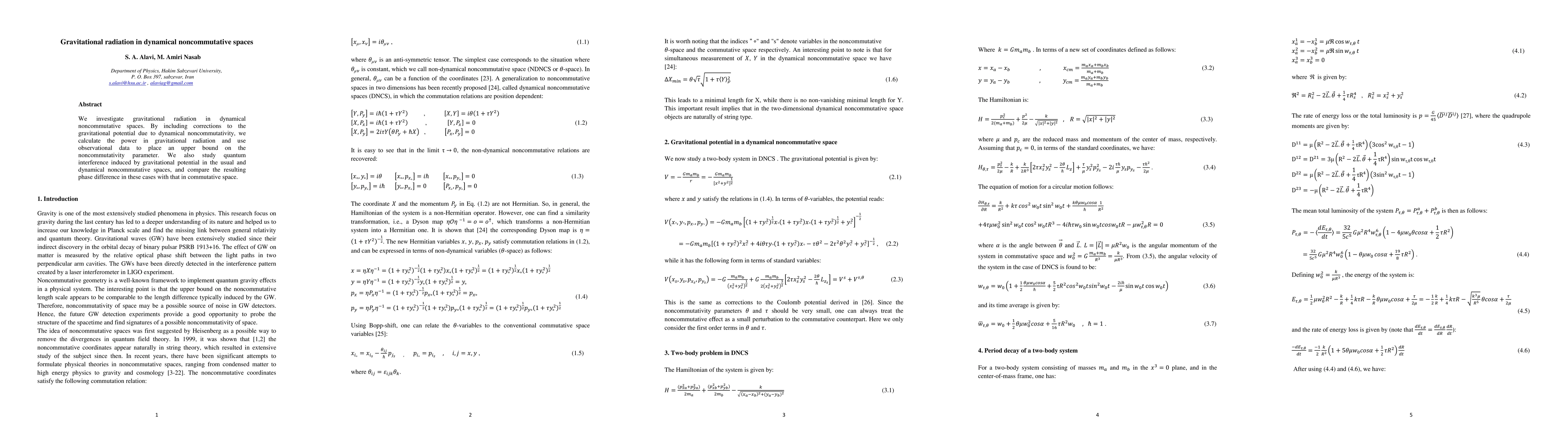 This research examines gravitational radiation within dynamical noncommutative spaces, calculating the power of gravitational radiation with corrections for noncommutativity and using observational data to limit the noncommutativity parameter. It also explores quantum interference differences between usual, dynamical noncommutative, and commutative spaces.