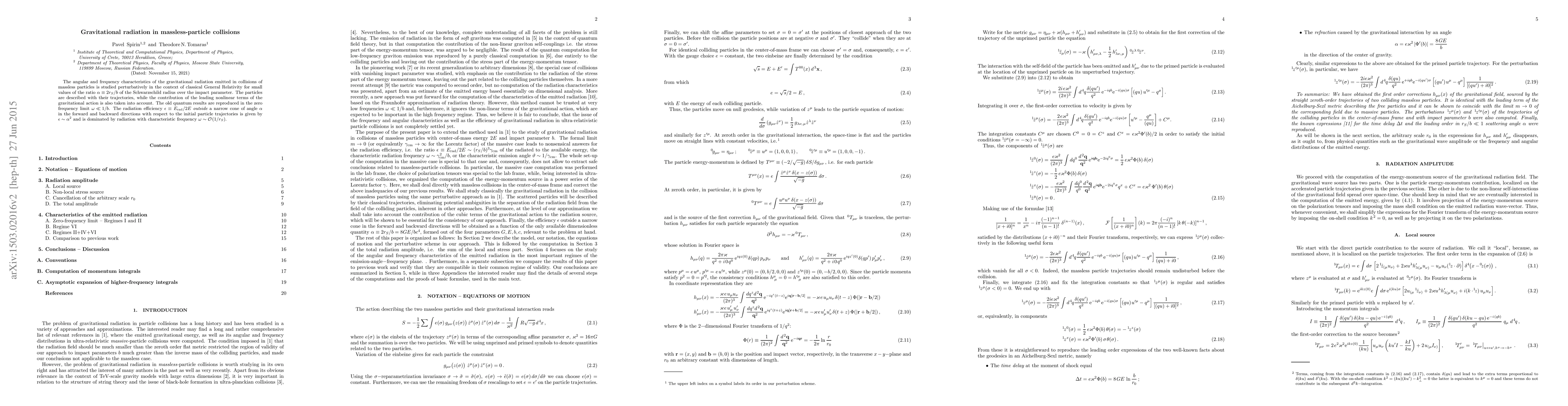 This paper investigates the gravitational radiation from massless particle collisions within the framework of classical General Relativity, focusing on small ratios of the Schwarzschild radius to the impact parameter. It finds that the radiation efficiency is proportional to the square of this ratio and is dominated by radiation with a characteristic frequency of order 1/Schwarzschild radius.
