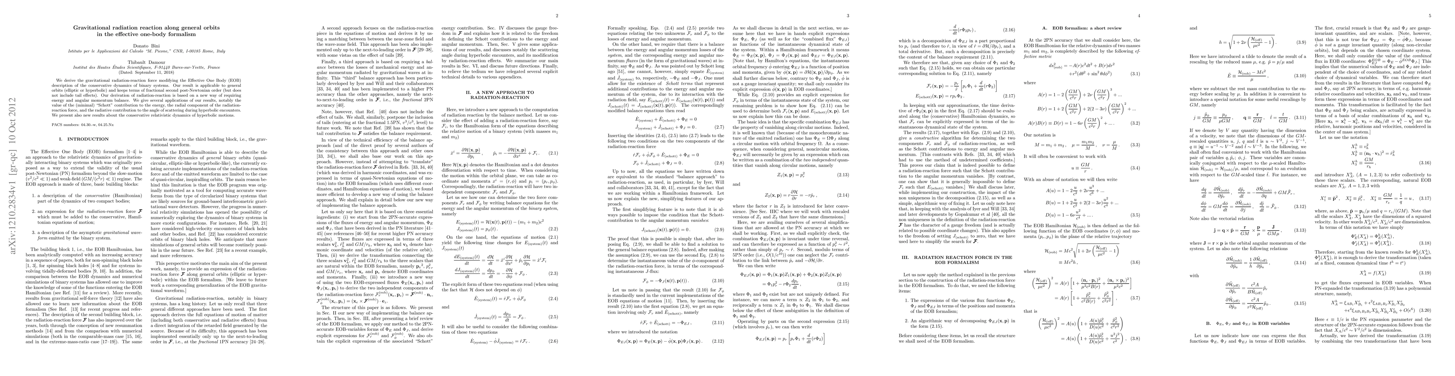 This paper derives the gravitational radiation-reaction force within the Effective One Body formalism for general orbits, achieving fractional second post-Newtonian order. It introduces a novel method to balance energy and angular momentum, providing applications such as the Schott contribution to energy and the scattering angle in hyperbolic encounters.