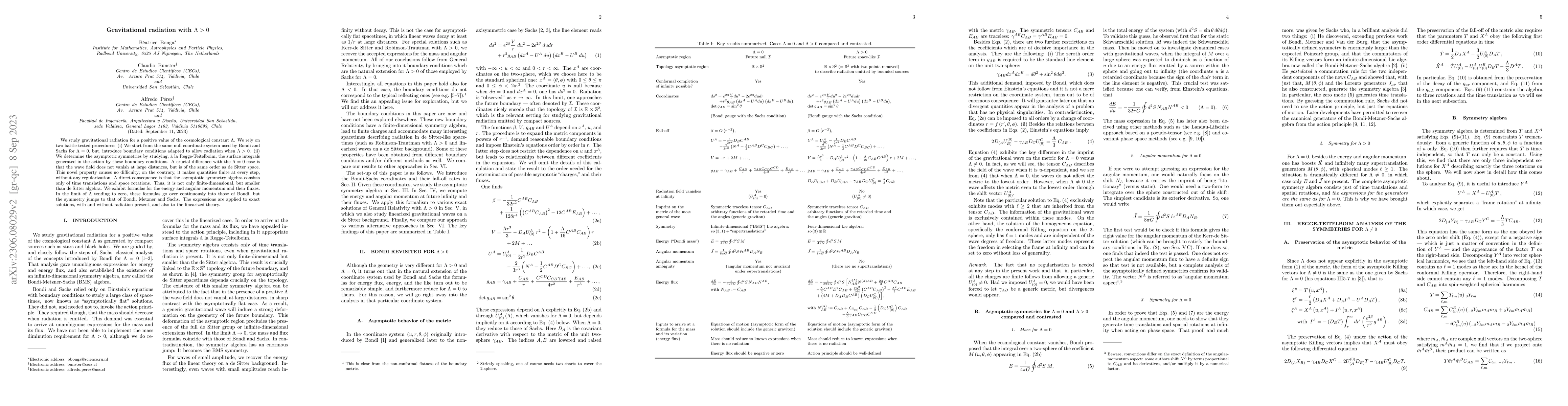 We study gravitational radiation for a positive value of the cosmological constant $\Lambda$. We rely on two battle-tested procedures: (i) We start from the same null coordinate system used by Bondi and Sachs for $\Lambda = 0$, but, introduce boundary conditions adapted to allow radiation when $\Lambda>0$. (ii) We determine the asymptotic symmetries by studying, \`a la Regge-Teitelboim, the surface integrals generated in the action by these boundary conditions. A crucial difference with the $\Lambda=0$ case is that the wave field does not vanish at large distances, but is of the same order as de Sitter space. This novel property causes no difficulty; on the contrary, it makes quantities finite at every step, without any regularization. A direct consequence is that the asymptotic symmetry algebra consists only of time translations and space rotations. Thus, it is not only finite-dimensional, but smaller than de Sitter algebra. We exhibit formulas for the energy and angular momentum and their fluxes. In the limit of $\Lambda$ tending to zero, these formulas go over continuously into those of Bondi, but the symmetry jumps to that of Bondi, Metzner and Sachs. The expressions are applied to exact solutions, with and without radiation present, and also to the linearized theory.