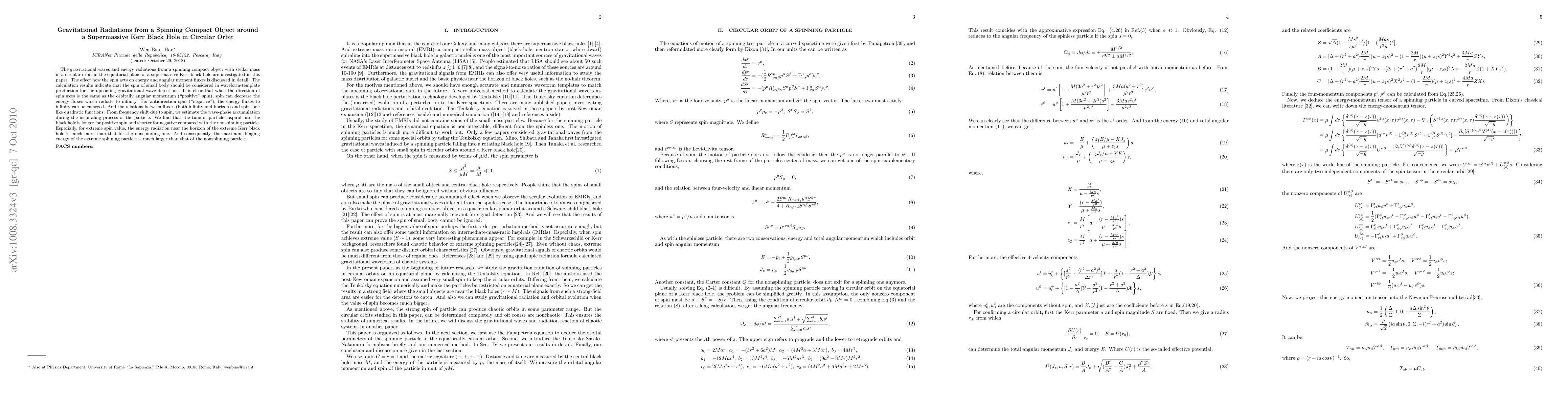 This paper investigates gravitational waves and energy radiations from a spinning compact object orbiting a supermassive Kerr black hole. It finds that the spin of the compact object significantly affects energy and angular momentum fluxes, influencing the waveform templates for gravitational wave detections.