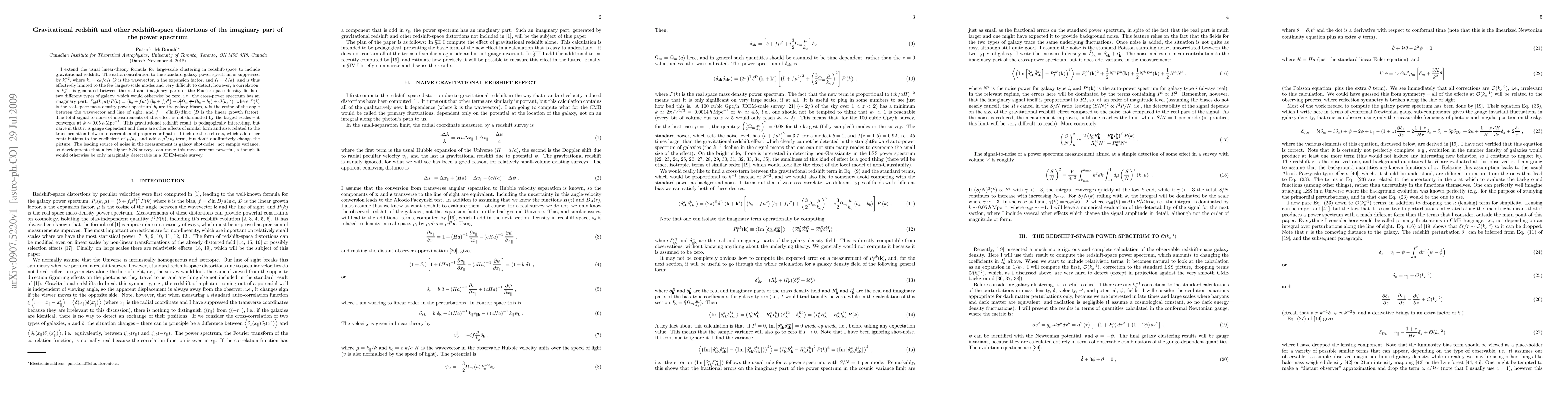 I extend the usual linear-theory formula for large-scale clustering in redshift-space to include gravitational redshift. The extra contribution to the standard galaxy power spectrum is suppressed by k_c^{-2}, where k_c=c k/a H (k is the wavevector, a the expansion factor, and H=\dot{a}/a), and is thus effectively limited to the few largest-scale modes and very difficult to detect; however, a correlation, \propto k_c^{-1}, is generated between the real and imaginary parts of the Fourier space density fields of two different types of galaxy, which would otherwise be zero, i.e., the cross-power spectrum has an imaginary part: P_{ab}(k,\mu)/P(k)=(b_a+f\mu^2)(b_b+f\mu^2) -i(3\Omega_m/2)(\mu/k_c)(b_a-b_b)+\mathcal{O}(k_c^{-2}), where P(k) is the real-space mass-density power spectrum, b_i are the galaxy biases, \mu is the cosine of the angle between the wavevector and line of sight, and f=dlnD/dlna (D is the linear growth factor). The total signal-to-noise of measurements of this effect is not dominated by the largest scales -- it converges at k~0.05 h/Mpc. This gravitational redshift result is pedagogically interesting, but naive in that it is gauge dependent and there are other effects of similar form and size, related to the transformation between observable and proper coordinates. I include these effects, which add other contributions to the coefficient of \mu/k_c, and add a \mu^3/k_c term, but don't qualitatively change the picture. The leading source of noise in the measurement is galaxy shot-noise, not sample variance, so developments that allow higher S/N surveys can make this measurement powerful, although it would otherwise be only marginally detectable in a JDEM-scale survey.