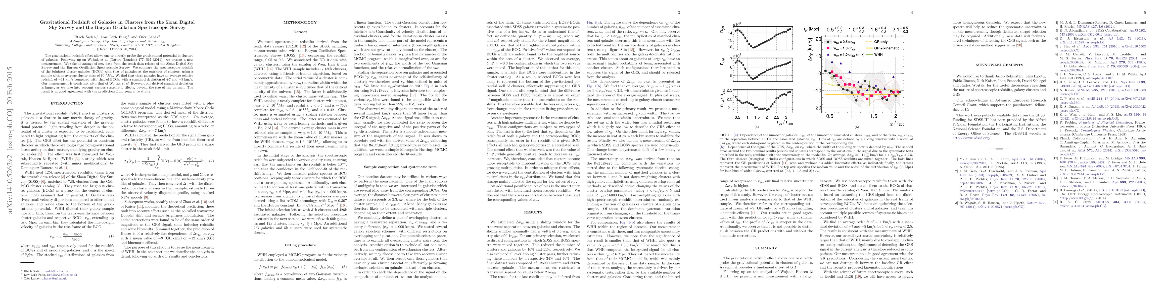This study measures gravitational redshift in galaxy clusters using data from the Sloan Digital Sky Survey and the Baryon Oscillation Spectroscopic Survey, finding that galaxies at the cluster outskirts have an average redshift of -11 km/s compared to the brightest cluster galaxies, consistent with predictions from general relativity. The larger standard deviation accounts for systematic effects beyond dataset size.