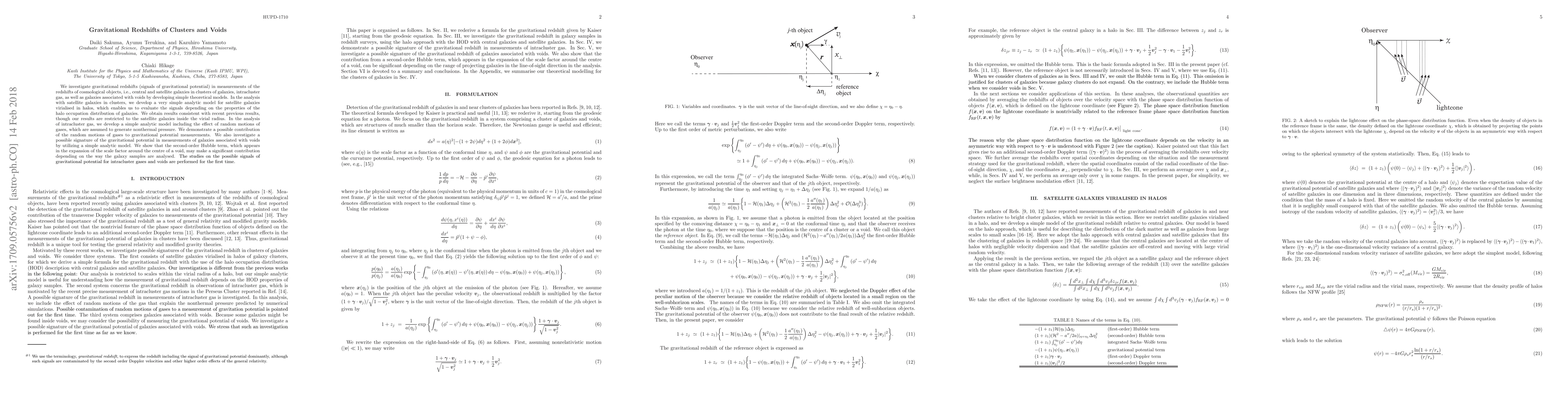Gravitational redshift as a relativistic effect in cosmological objects is investigated. Possible signatures of the gravitational redshift in measurements of satellite galaxies in clusters of galaxies, intracluster gas, as well as galaxies associated with voids are investigated by developing simple theoretical models. In the analysis of the gravitational redshift of satellite galaxies, we develop a very simple analytic model for satellite galaxies virialised in halos, which enables us to evaluate the signals depending on the properties of the halo occupation distribution of galaxies. We obtain results consistent with recent previous results, though our results are restricted to the satellite galaxies inside the virial radius. In the analysis of intracluster gas, we develop a simple analytic model including the effect of random motions of gases, which are assumed to generate nonthermal pressure. We demonstrate a possible contribution of the random motions of gases to the gravitational redshift. We also investigate a possible signature of the gravitational redshift in measurements of galaxies associated with voids, for the first time as far as we know, by utilising a simple analytic model. We show that the second-order Hubble term, which appears in the expansion of the scale factor around the centre of a void, may make a significant contribution depending on the way the galaxy samples are analysed.