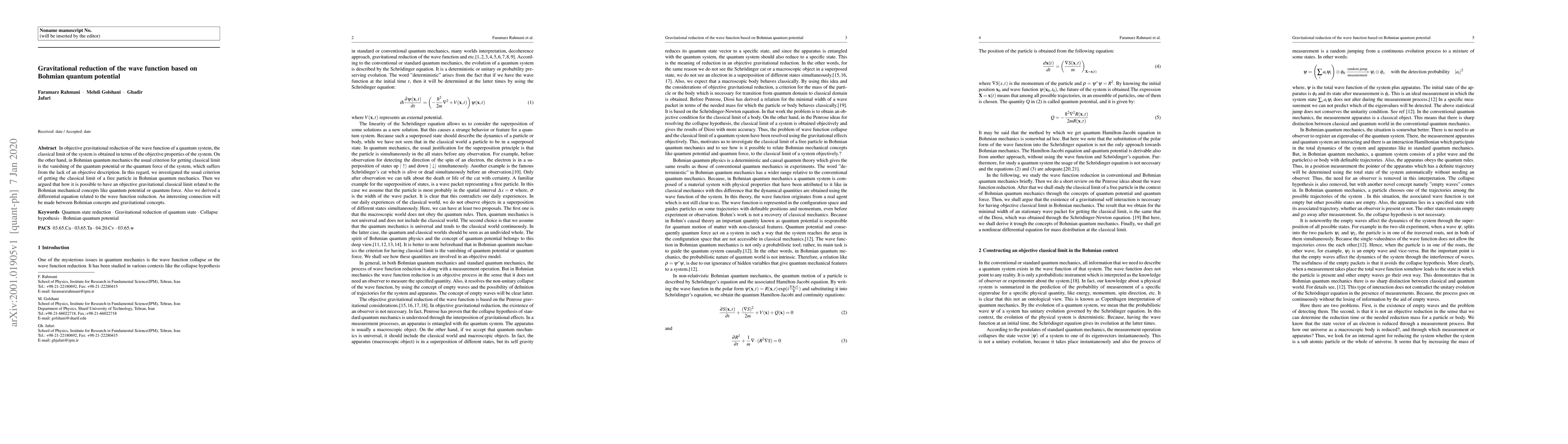 Researchers investigated how Bohmian quantum mechanics can achieve an objective classical limit related to gravity, leading to a new connection between wave function reduction and gravitational concepts.
