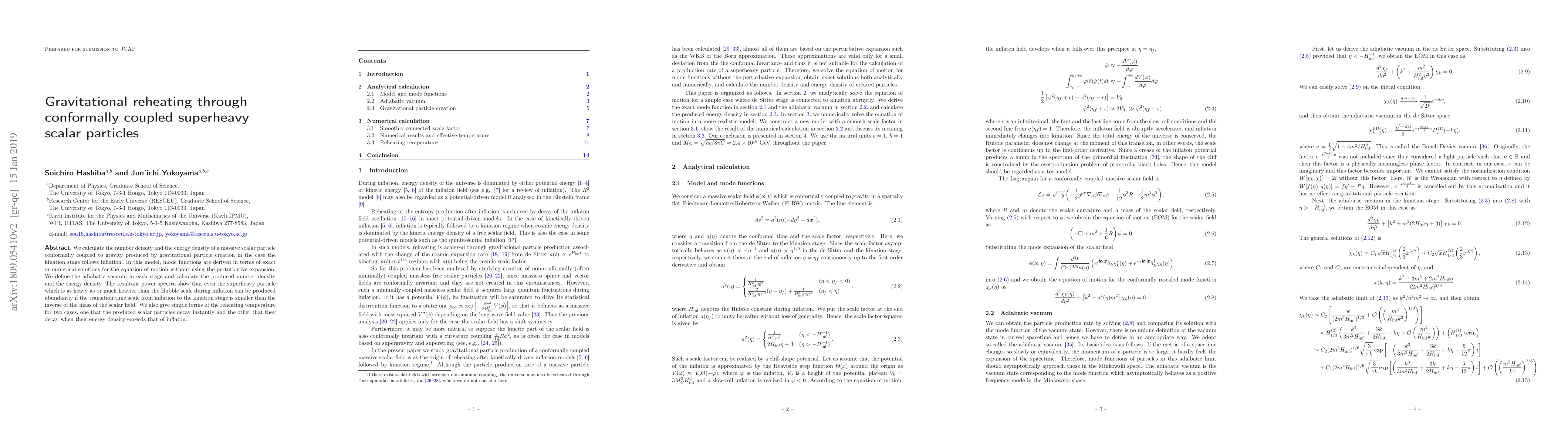 This paper investigates gravitational reheating via conformally coupled superheavy scalar particles, calculating their number and energy densities produced by gravitational particle creation. It finds that such particles can be abundantly produced if the transition from inflation to the kination stage is swift, and provides expressions for reheating temperatures based on scalar particle decay scenarios.