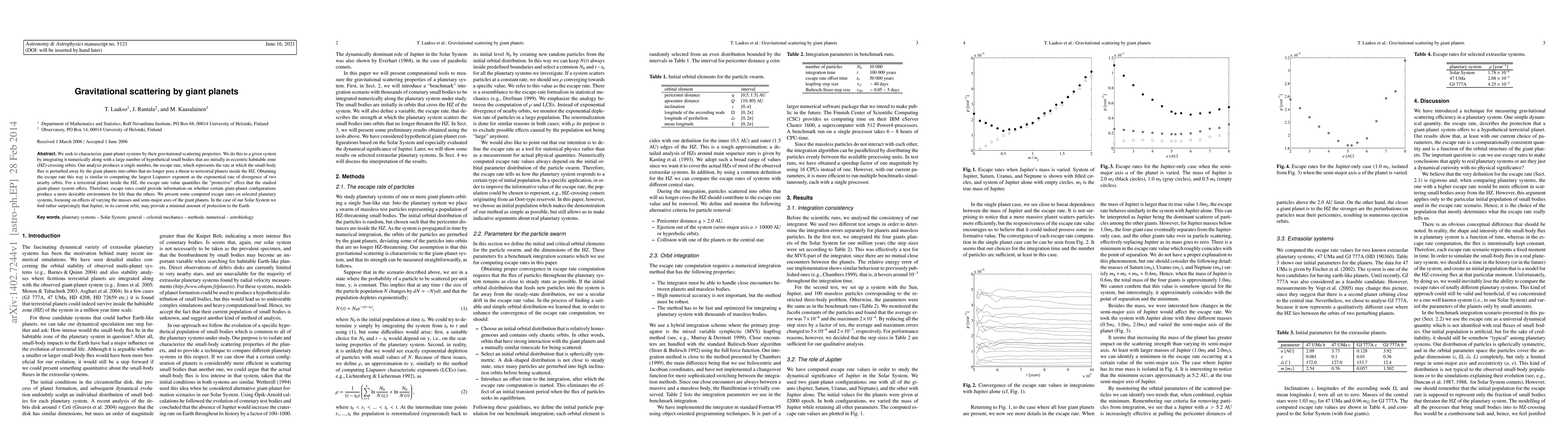 We seek to characterize giant-planet systems by their gravitational scattering properties. We do this to a given system by integrating it numerically along with a large number of hypothetical small bodies that are initially in eccentric habitable zone (HZ)-crossing orbits. Our analysis produces a single number, the escape rate, which represents the rate at which the small-body flux is perturbed away by the giant planets into orbits that no longer pose a threat to terrestrial planets inside the HZ. Obtaining the escape rate this way is similar to computing the largest Liapunov exponent as the exponential rate of divergence of two nearby orbits. For a terrestrial planet inside the HZ, the escape rate value quantifies the "protective" effect that the studied giant-planet system offers. Therefore, escape rates could provide information on whether certain giant-planet configurations produce a more desirable environment for life than the others. We present some computed escape rates on selected planetary systems, focusing on effects of varying the masses and semi-major axes of the giant planets. In the case of our Solar System we find rather surprisingly that Jupiter, in its current orbit, may provide a minimal amount of protection to the Earth.