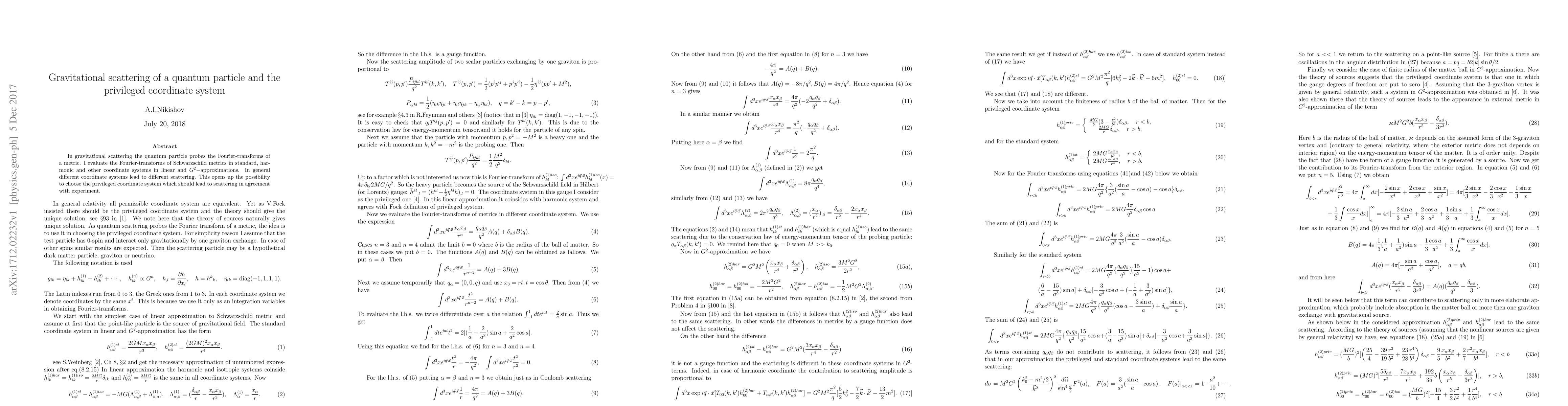 In gravitational scattering the quantum particle probes the Fourier-transforms of a metric. I evaluate the Fourier-transforms of Schwarzschild metrics in standard, harmonic and other coordinate systems in linear and $G^2-$approximations. In general different coordinate systems lead to different scattering. This opens up the possibility to choose the privileged coordinate system which should lead to scattering in agreement with experiment.