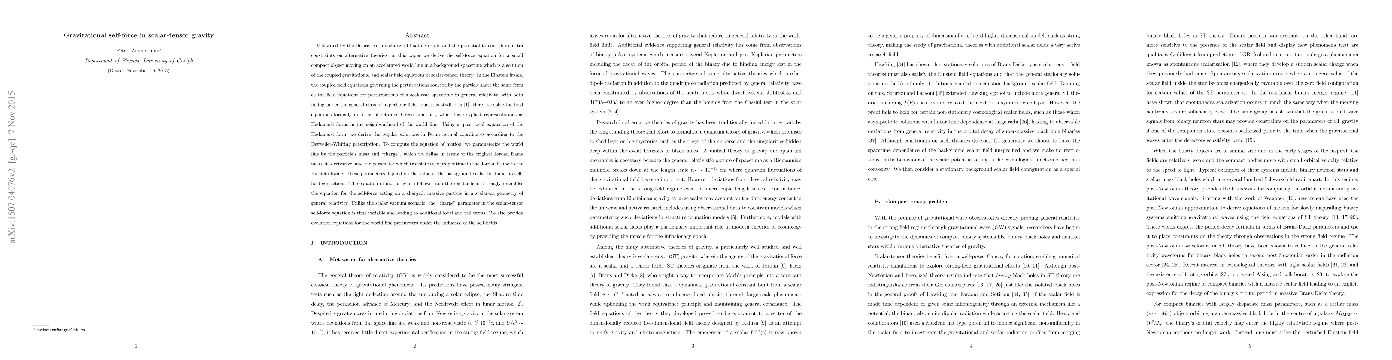 Motivated by the discovery of floating orbits and the potential to provide extra constraints on alternative theories, in this paper we derive the self-force equation for a small compact object moving on an accelerated world line in a background spacetime which is a solution of the coupled gravitational and scalar field equations of scalar-tensor theory. In the Einstein frame, the coupled field equations governing the perturbations sourced by the particle share the same form as the field equations for perturbations of a scalarvac spacetime, with both falling under the general class of hyperbolic field equations studied by Zimmerman and Poisson. Here, we solve the field equations formally in terms of retarded Green functions, which have explicit representations as Hadamard forms in the neighbourhood of the world line. Using a quasi-local expansion of the Hadamard form, we derive the regular solutions in Fermi normal coordinates according to the Detweiler-Whiting prescription. To compute the equation of motion, we parameterize the world line in terms of a mass and "charge", which we define in terms of the original Jordan frame mass, its derivative, and the parameter which translates the proper time in the Jordan frame to the Einstein frame. These parameters depend on the value of the background scalar field and its self-field corrections. The equation of motion which follows from the regular fields strongly resembles the equation for the self-force acting on a charged, massive particle in a scalarvac geometry of general relativity. Unlike the scalar vacuum scenario, the "charge" parameter in the scalar-tensor self-force equation is time variable and leading to additional local and tail terms. We also provide evolution equations for the world line parameters under the influence of the self-fields.